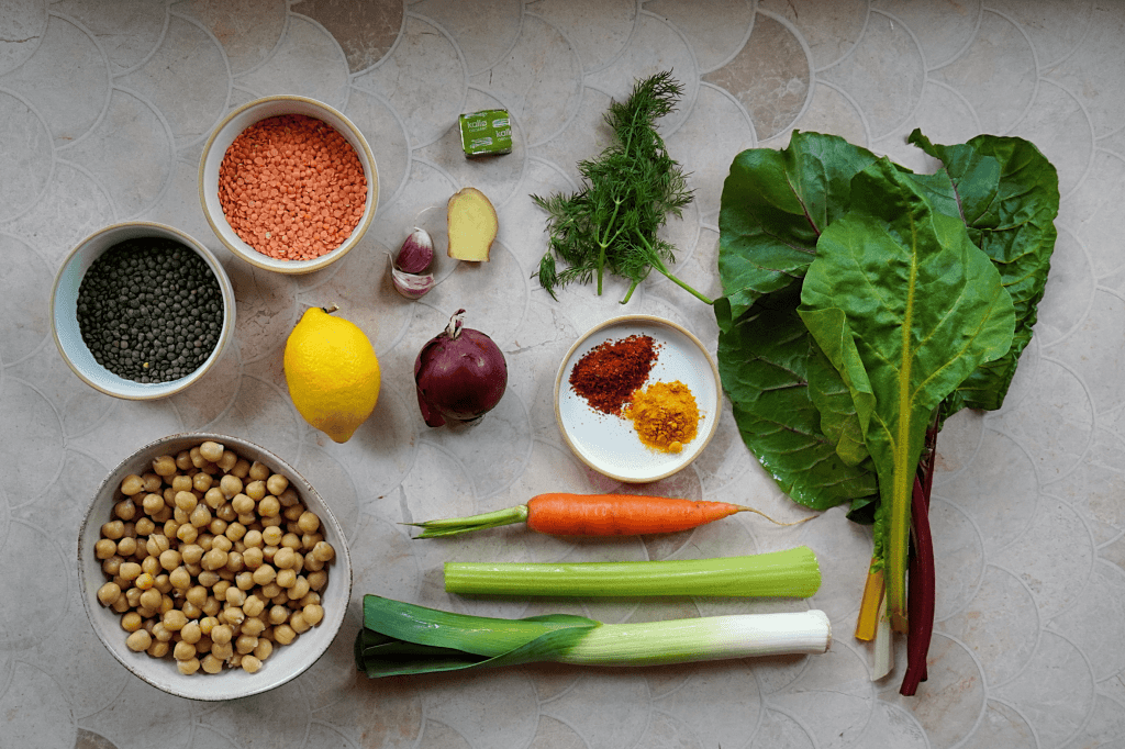 This is a simple recipe but I just wanted to add a note on legumes. If you suffer from digestive issues with these kinds of foods, I recommend taking a few steps. Firstly, for jarred or canned chickpeas: make sure you drain them and wash them thoroughly of the cooking liquid. For the dried lentils, you’re also going to want to rinse them very well. Although these are both quick cook lentil varieties, you may also want to consider soaking them in water 3-4 hours before you cook with them to further reduce those issues.