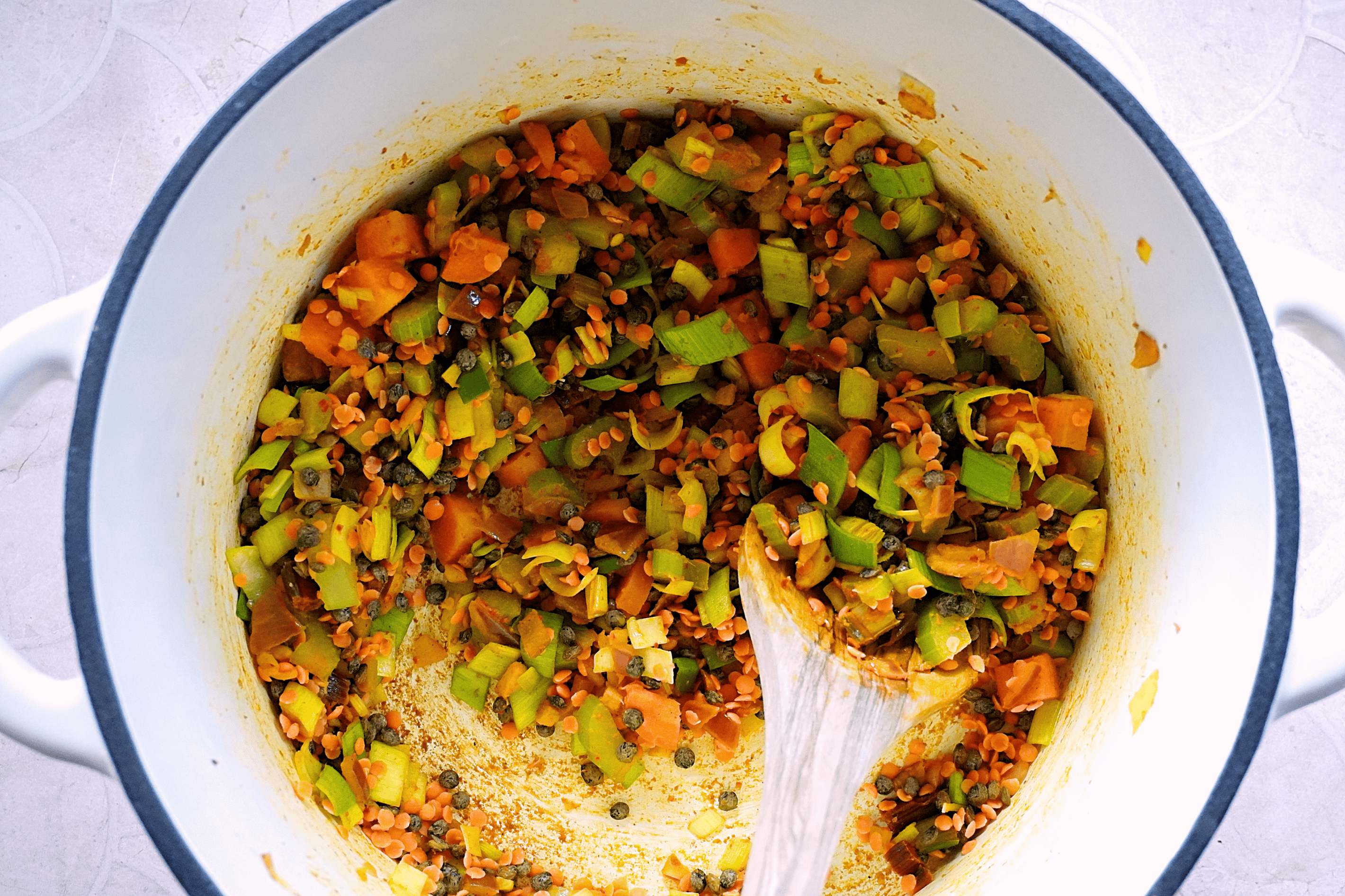 - Add the puy and red lentils, season again and allow to toast in the aromatics and spices for a couple of minutes before adding the stock – reduce the heat to a simmer and cover to cook for around 20 minutes until the puy lentils are firm but cooked through