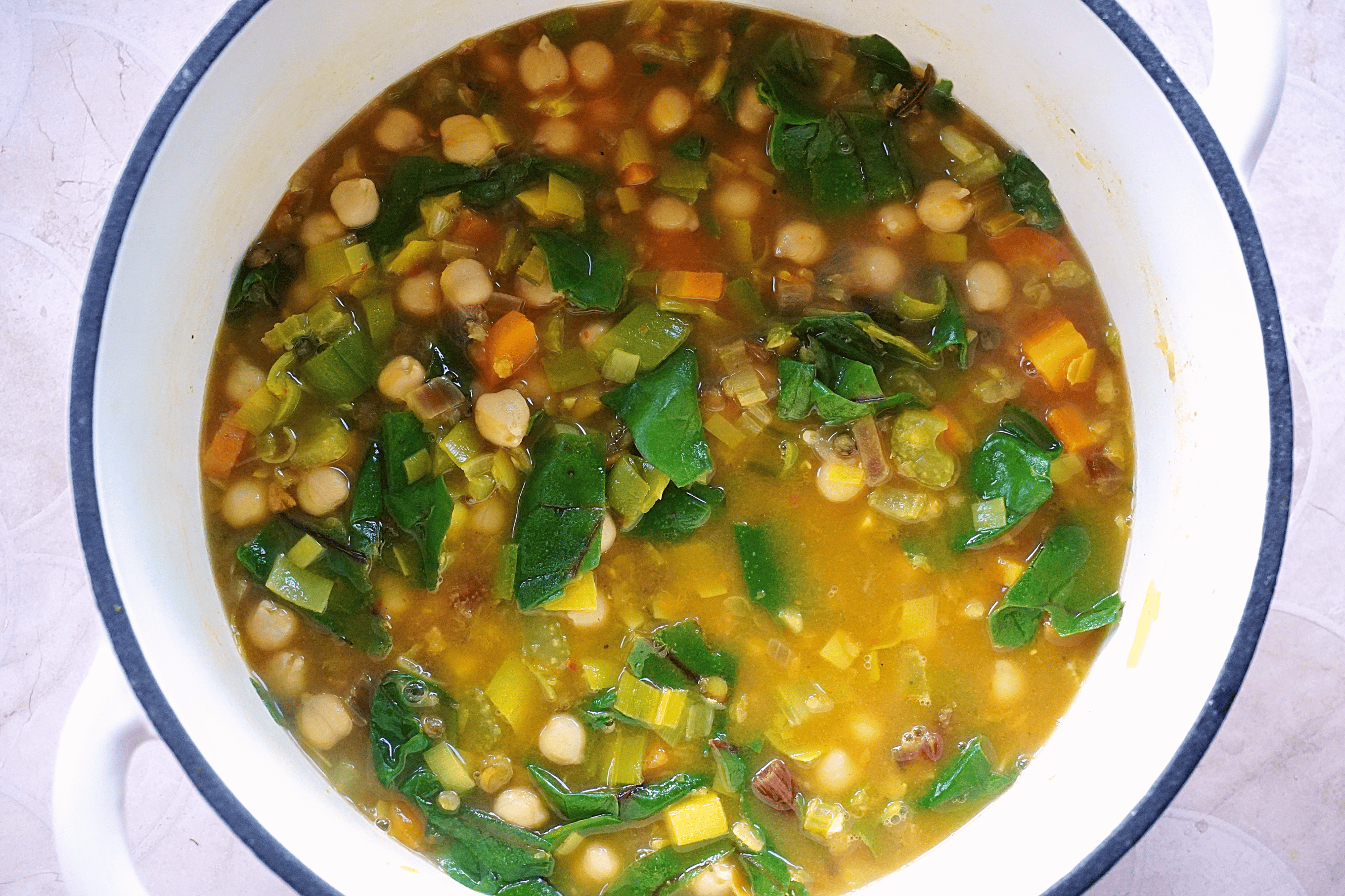 - Over a medium heat in a lidded pot, add a drizzle of olive oil and add the garlic, ginger, onion, leek, celery, carrot and chard stems and sauté for a couple of minutes until fragrant