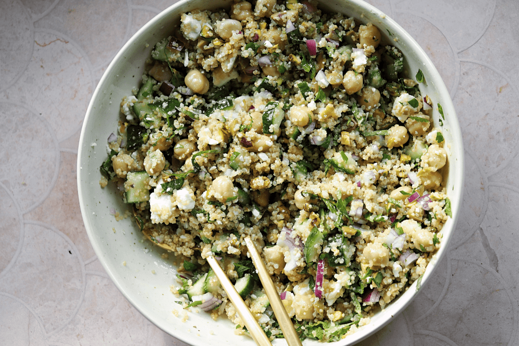 A Greek-style salad with quinoa and pistachios, insired by Jennifer Aniston