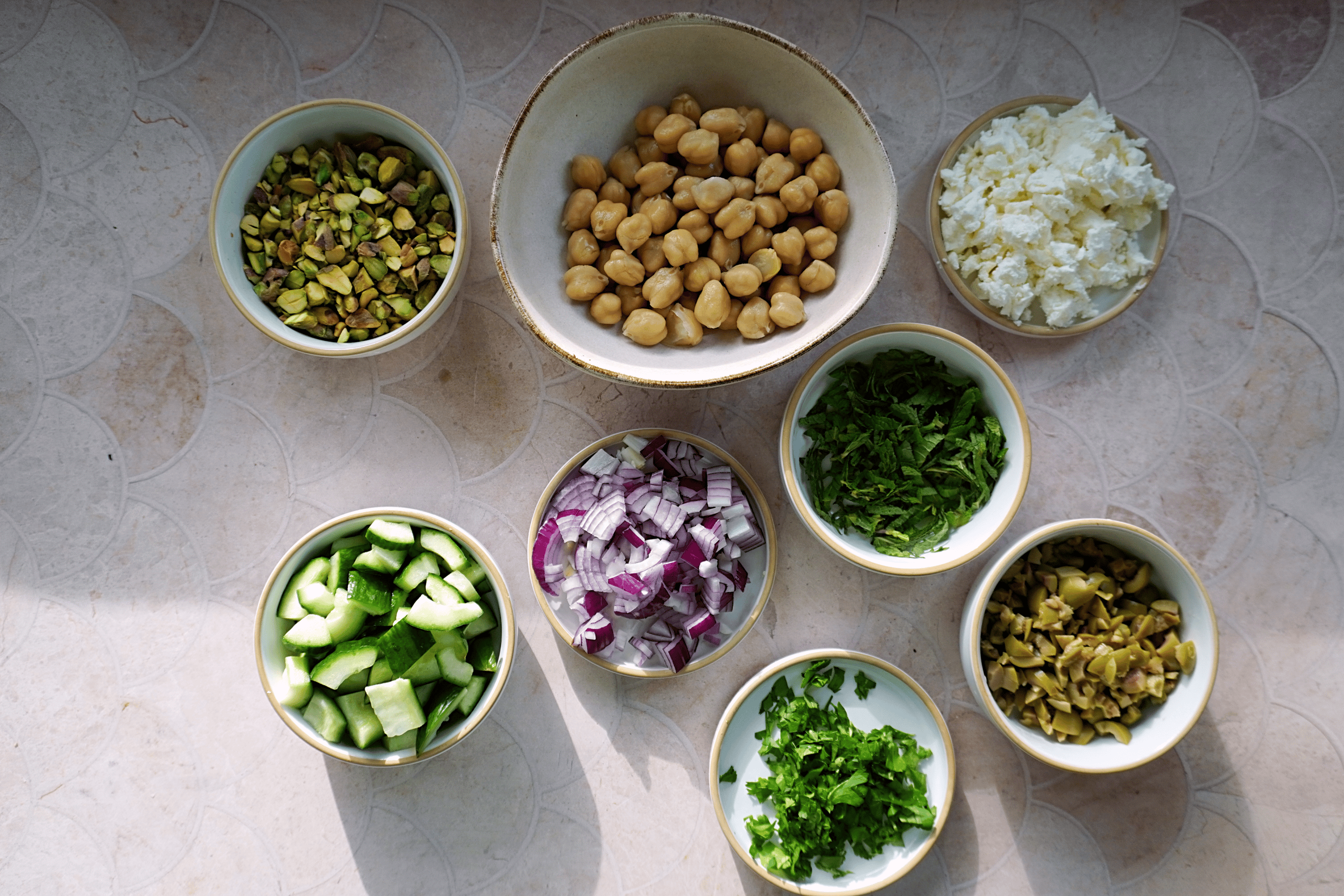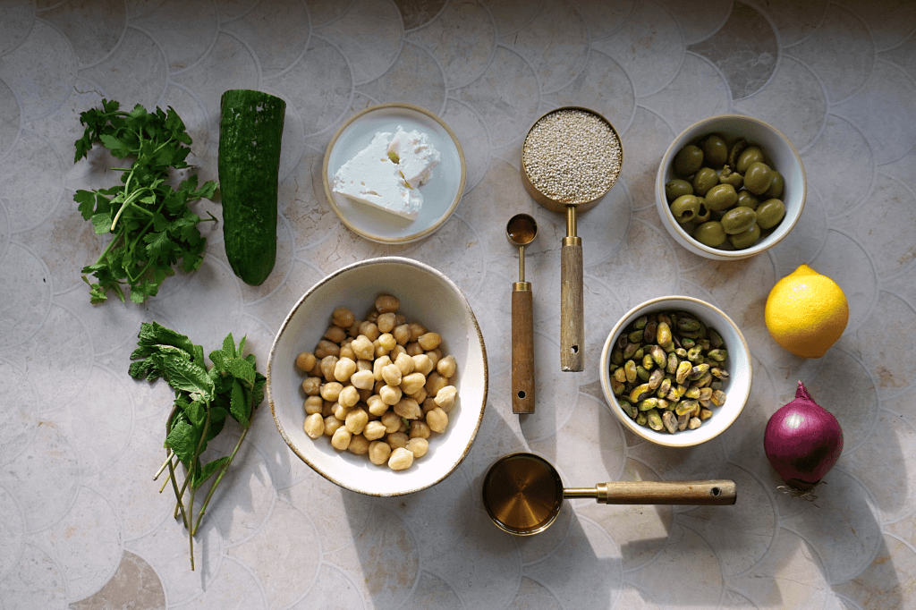 - Add the cooled quinoa to the chickpeas, olives, toasted chopped pistachio nuts, red onion, cucumber and fresh herbs, feta, pour over the dressing and toss together to combine