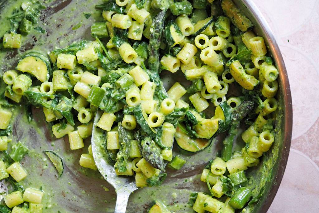 Creamy Rocket & Almond Pesto Pasta with Spring Vegetables