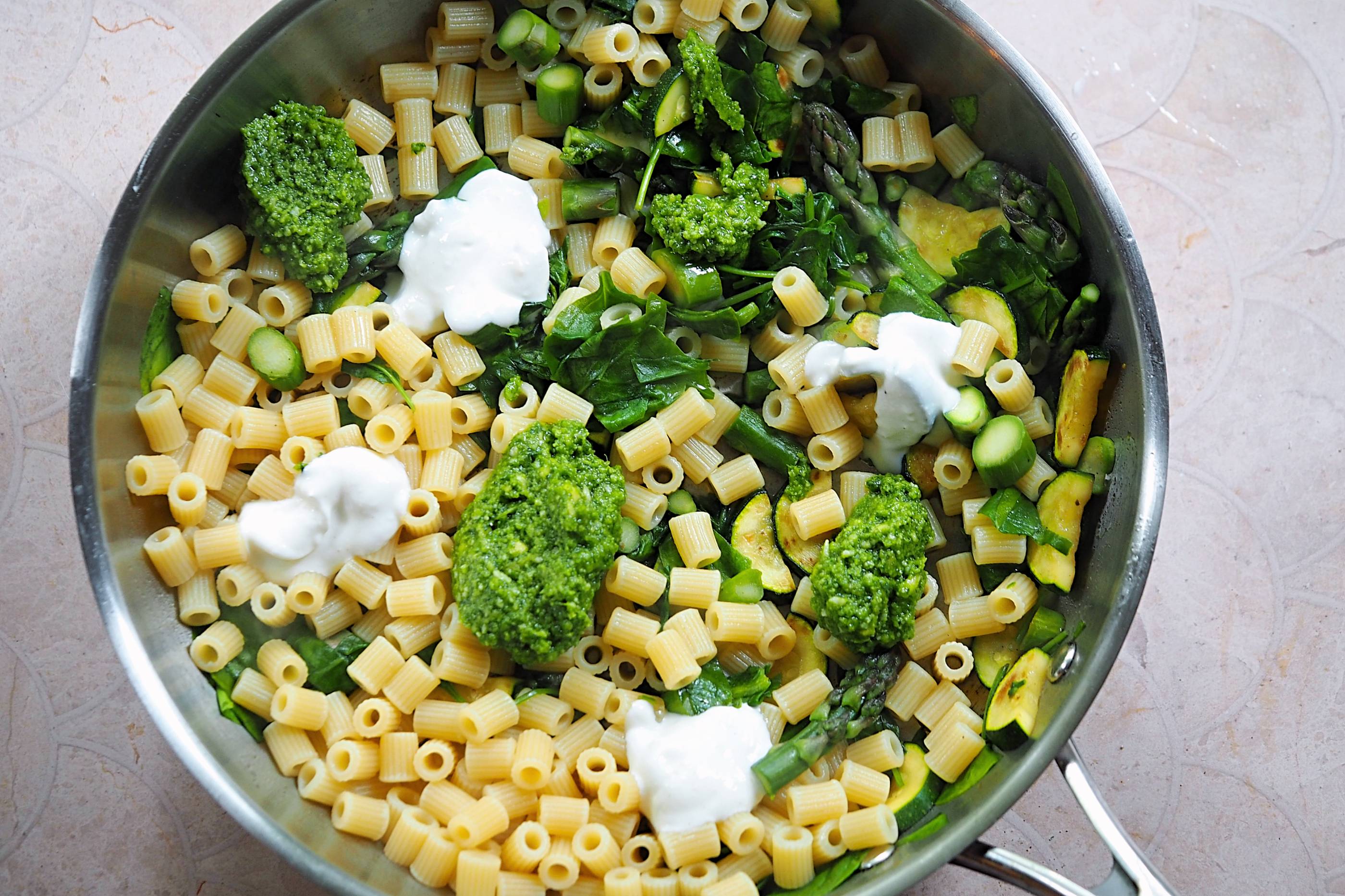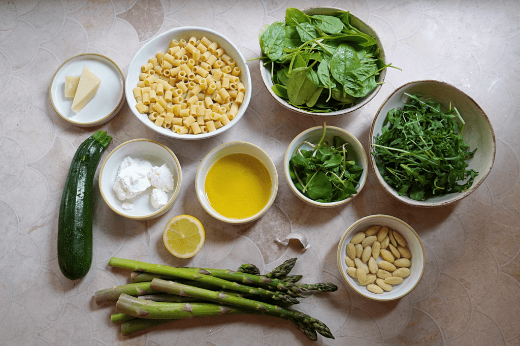 It’s probably not a secret that asparagus and ricotta are two of my standout ingredients for spring and today we’re creating a quick pesto pasta with seasonal greens that really hits the spot…