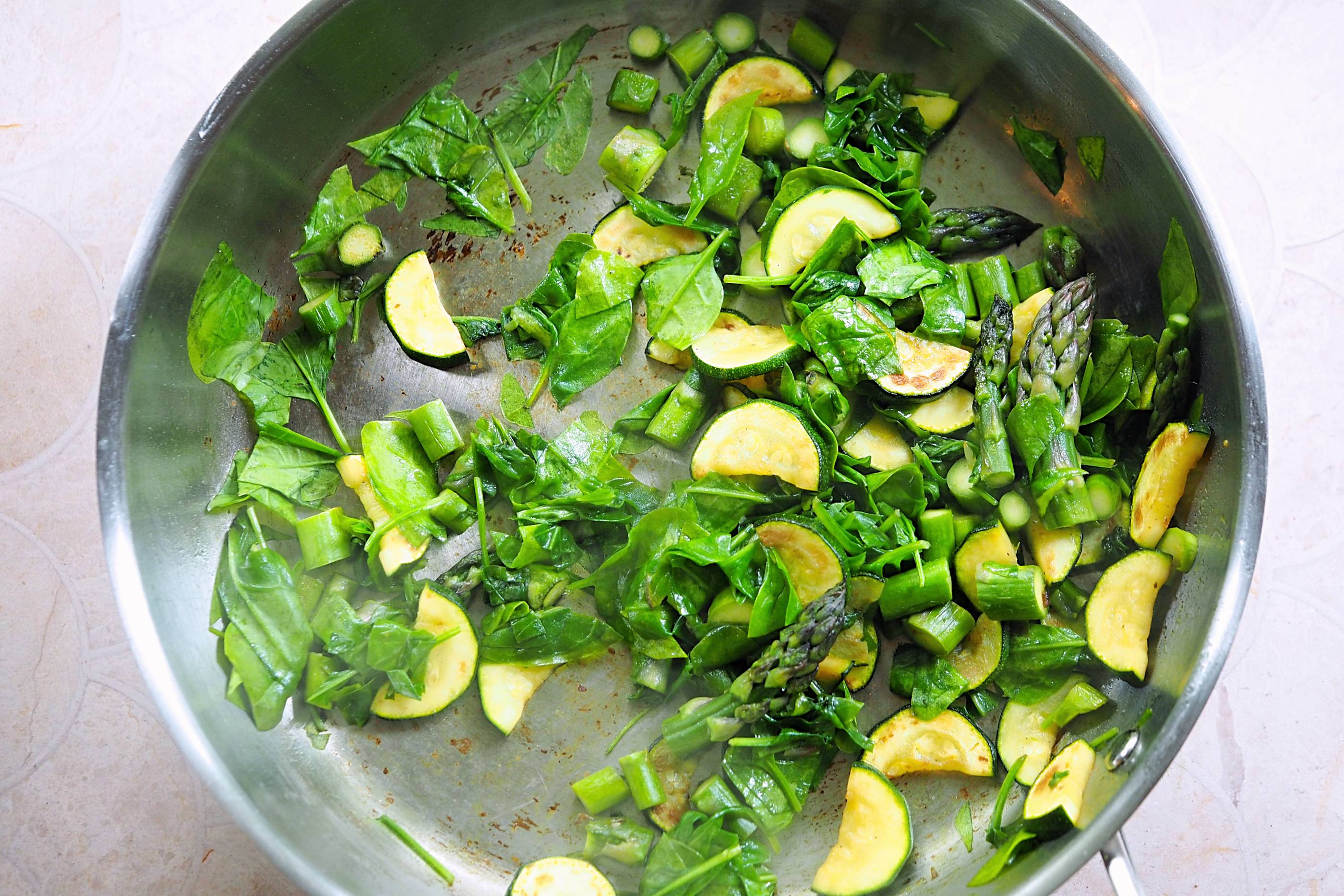 - Over a medium heat, in a large, wide-based lidded pan, add the courgette and sauté without oil for 5 minutes until it sweats off some moisture and picks up colour, then add the asparagus, some salt and pepper and a drizzle of oil, toss together and sauté for another few minutes