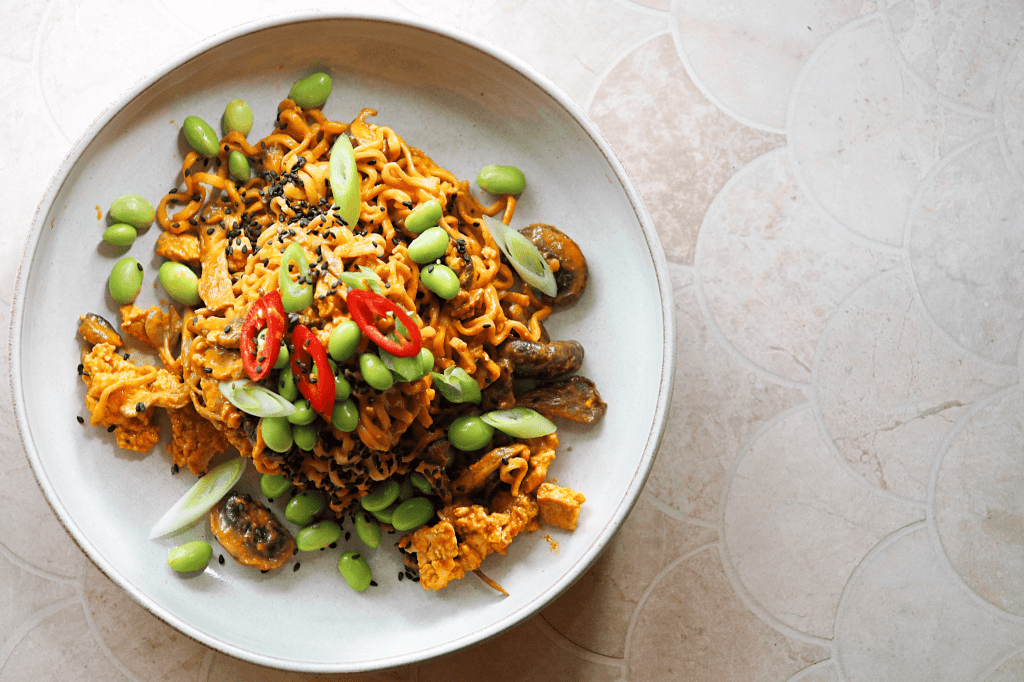 - Serve topped with the edamame beans, spring onions, chilli and toasted sesame seeds