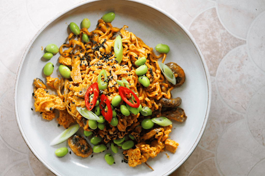 A lot of people think they don’t like tofu because they don’t know how to cook with it. It’s more of a flavour sponge than something that has much flavour in and of itself, so ideally you want to marinate it before use. When I’m not on my planning game, I just use smoked tofu because that has its own delicious flavour! The method I use for cooking it is very simple but it works well and it’s low-effort. I personally blended the sauce but if you don’t have a blender, you can use smooth peanut butter, a whisk and some elbow grease!