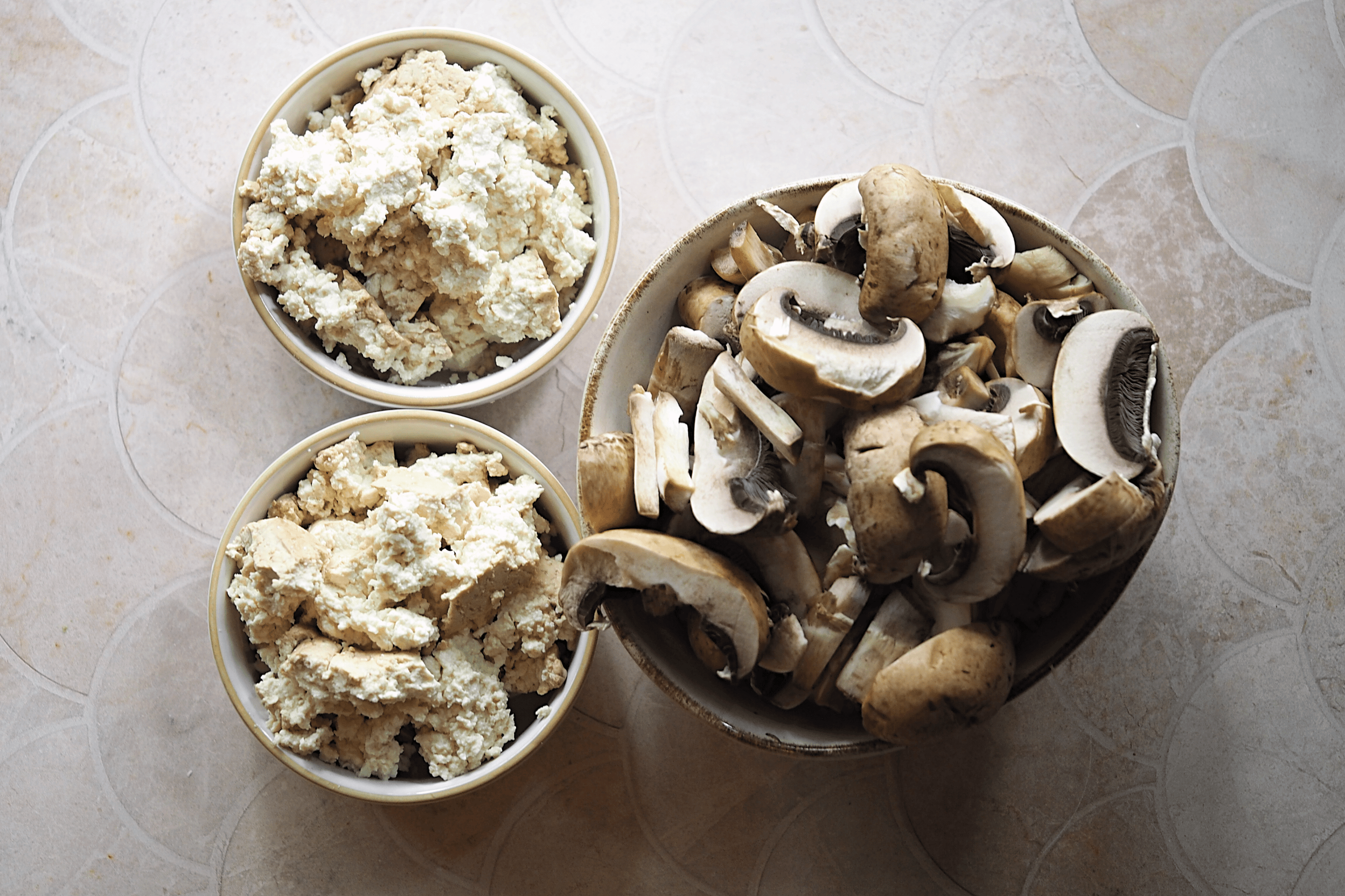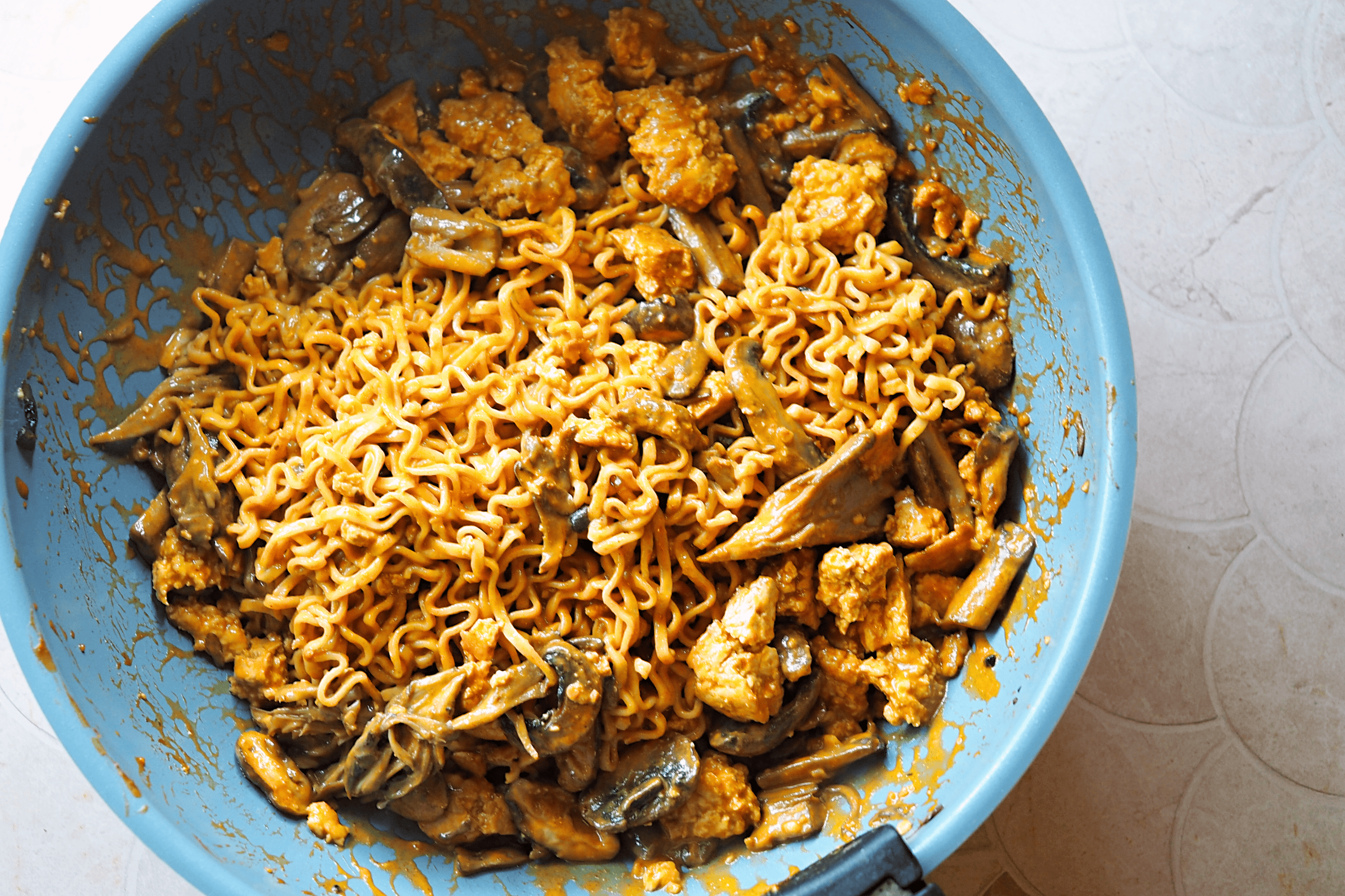 - Add the tofu, noodles and sauce to the mushrooms and toss together to stir fry for a couple of minutes