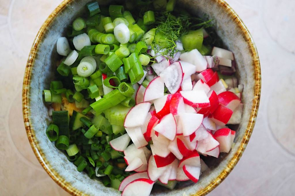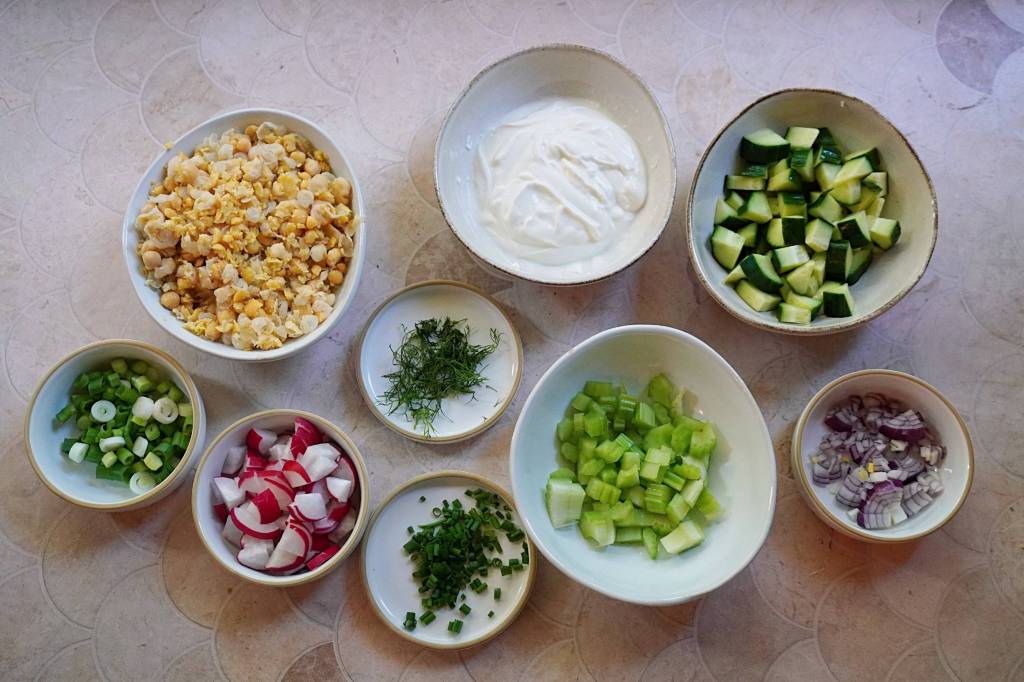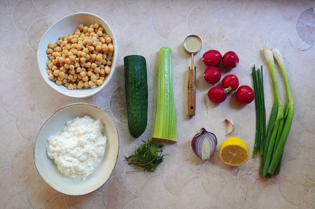 - Add half of the chickpeas, the radish, celery, spring onions, cucumber, red onion, dill and chives, season with salt and pepper