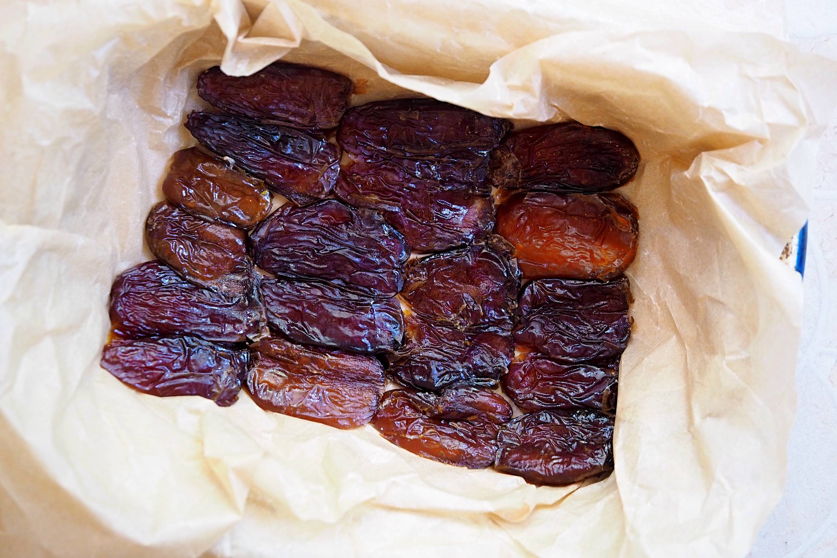 - Smush down the dates (sticky side down) on top of the greaseproof paper