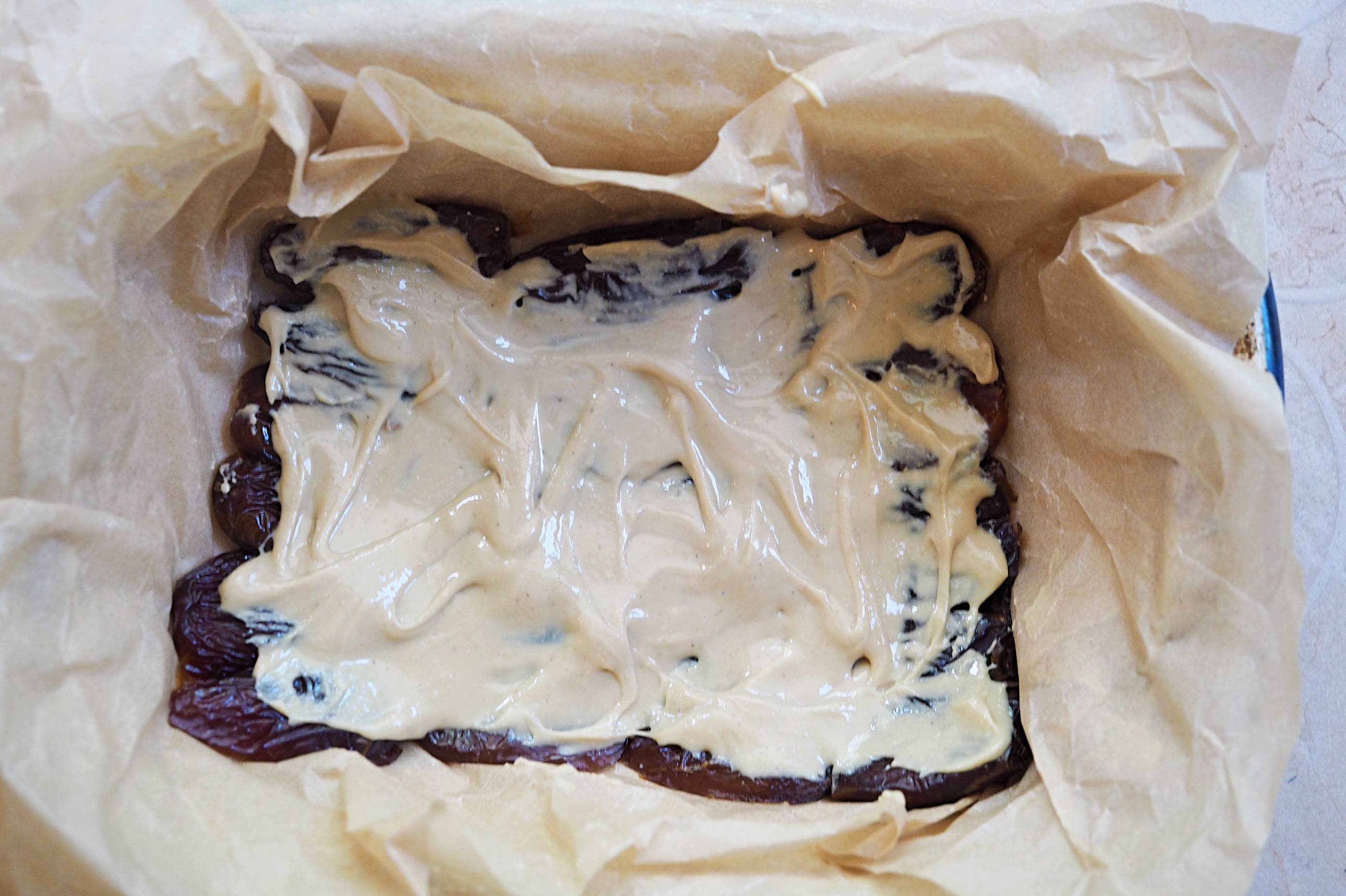 - Whilst the chocolate melts (this should take around 5-10 mins) pour the cashew butter over the date layer and spread it with a spatula or spoon