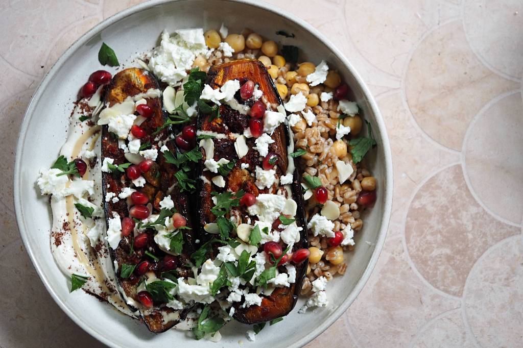- To your serving plate, add a layer of tahini yoghurt, spoon over the spelt and chickpeas and top off with the aubergine halves before drizzling over the reserved tahini, crumbling over the feta and topping with the parsley and pomegranate seeds