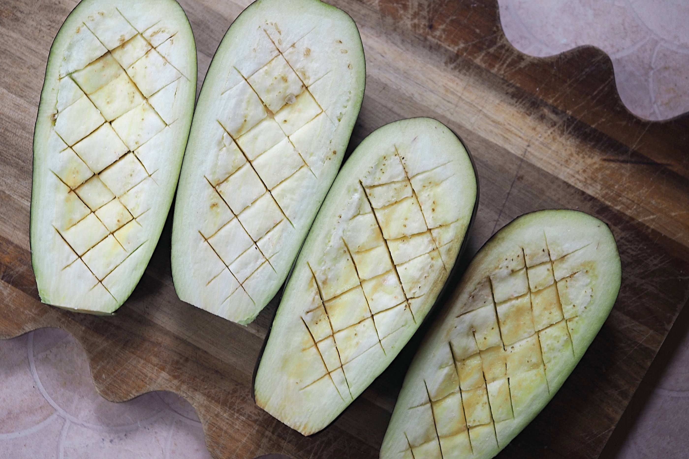- 2 medium aubergines (top removed, cut in half and scored in a cross-hatch pattern)