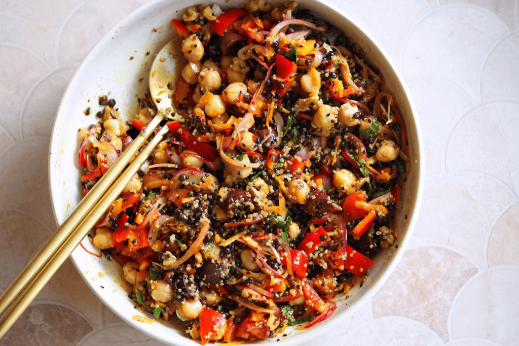 - Add the carrot, red pepper, quick picked red onions, chickpeas, lentils, quinoa, walnuts, nigella seeds, fresh herbs, kalamata olives and tomatoes to a salad bowl, pour over the dressing and toss together to combine before serving