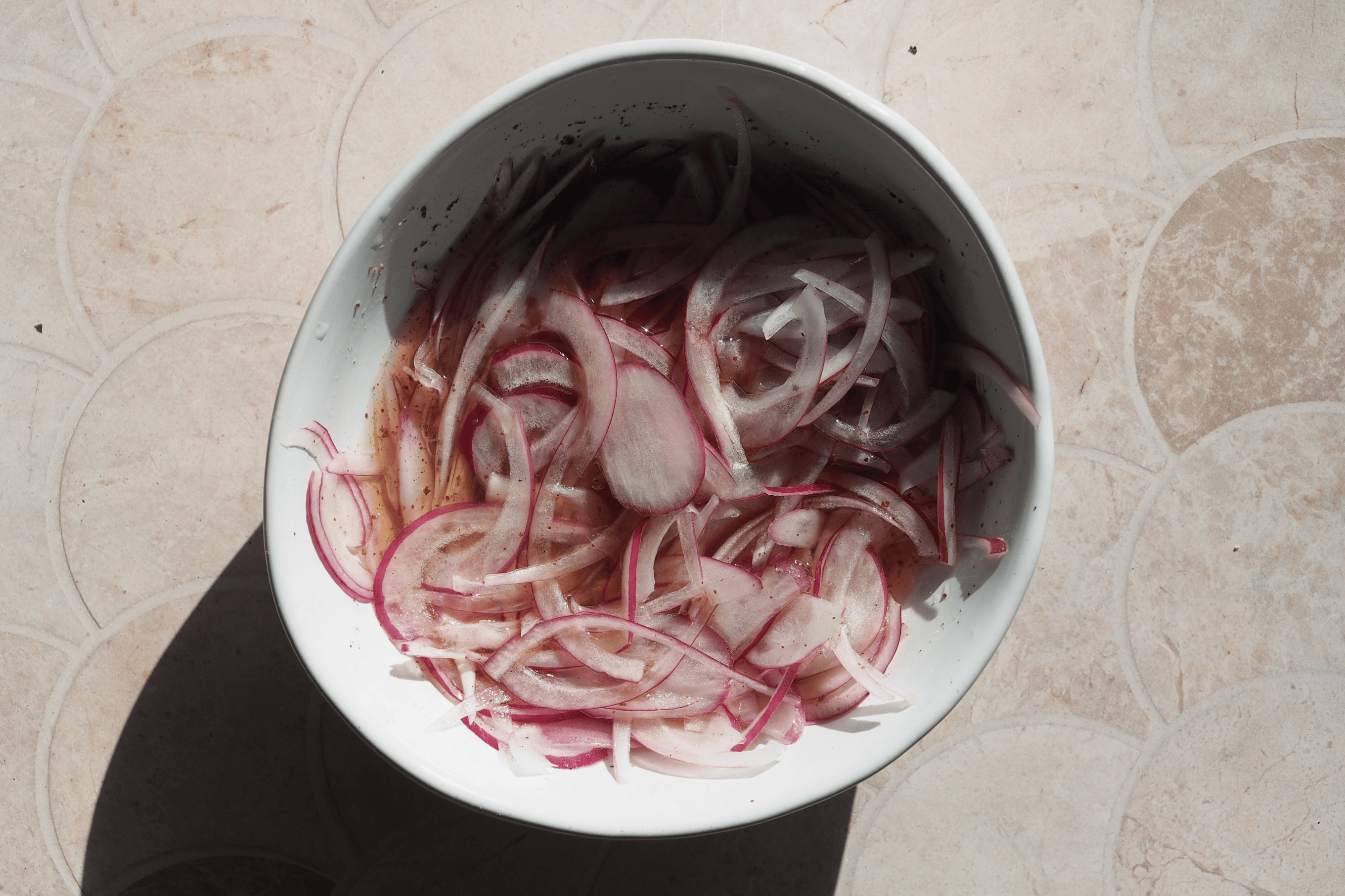 - Add the sugar, red wine vinegar, a pinch of salt and the red onion slices in a small bowl (submerge the onions as much as possible) and set aside for 20 mins to quick pickle