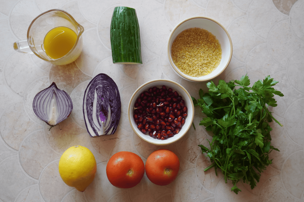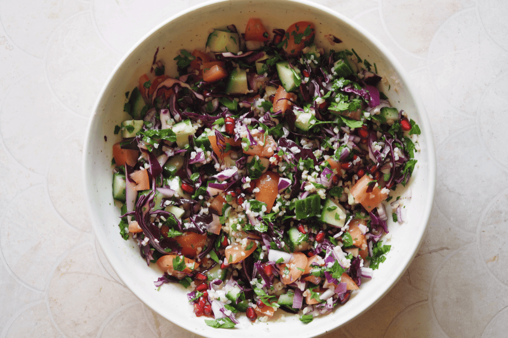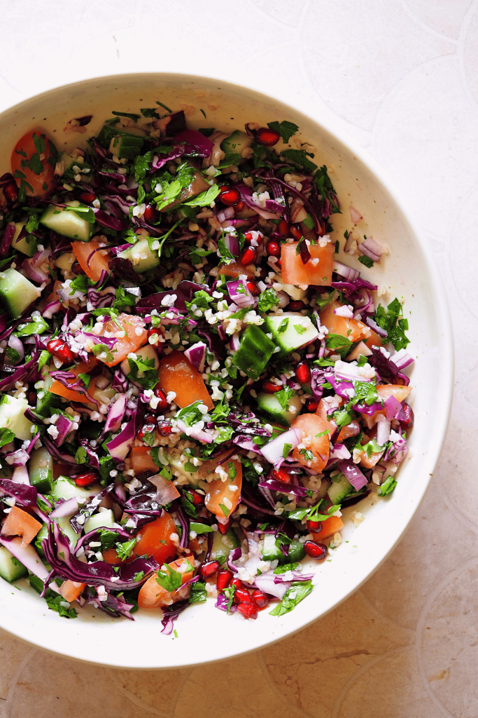 - Add the red cabbage, parsley, red onion, pomegranate seeds, tomato and cucumber to a salad bowl, pour over the dressing and toss together to serve