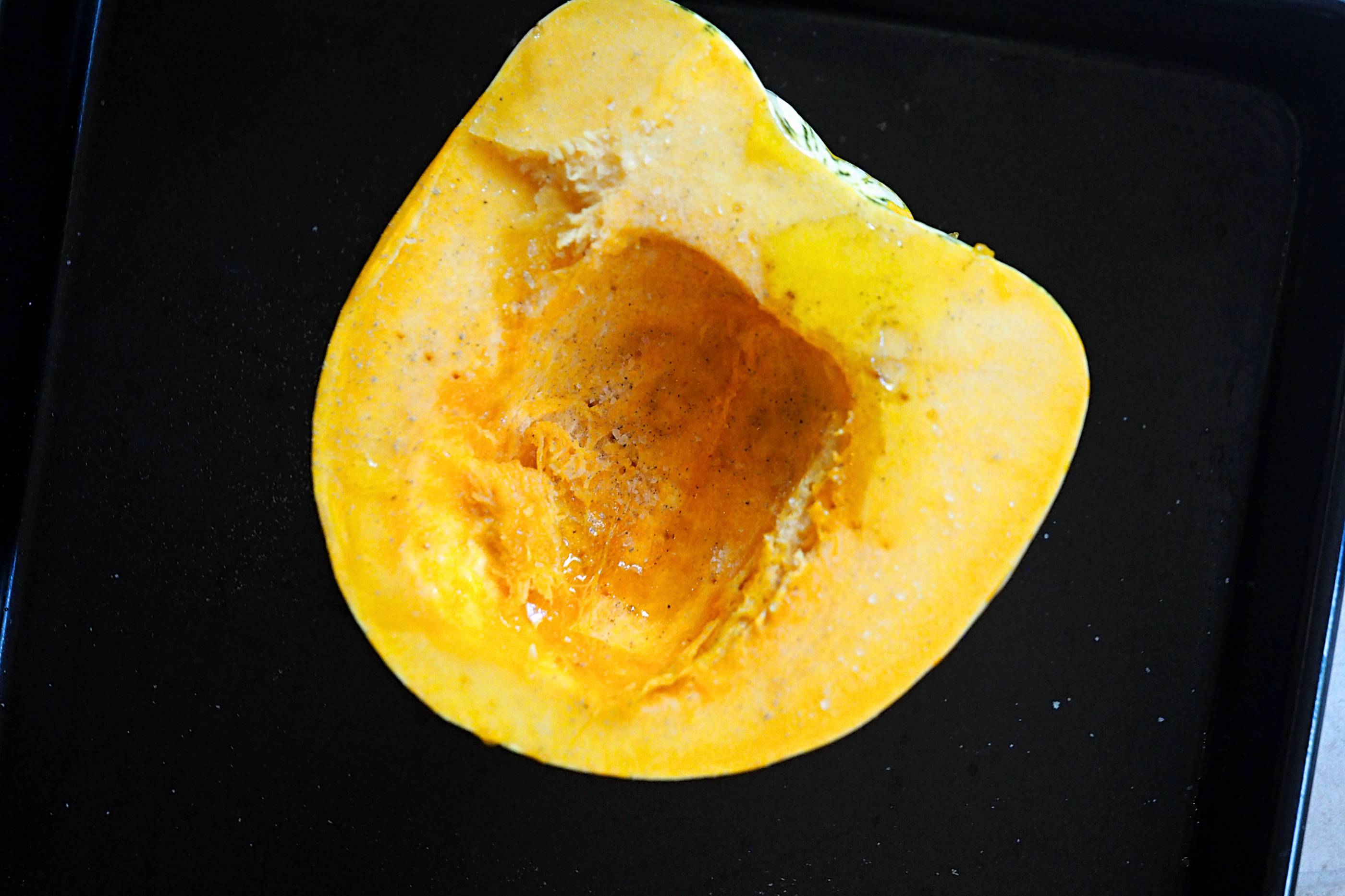 - De-seed the squash and pierce around 10 times on each side, add it to an oven dish, drizzle the inside with olive oil, season with salt and pepper and roast in the oven for 25 mins
