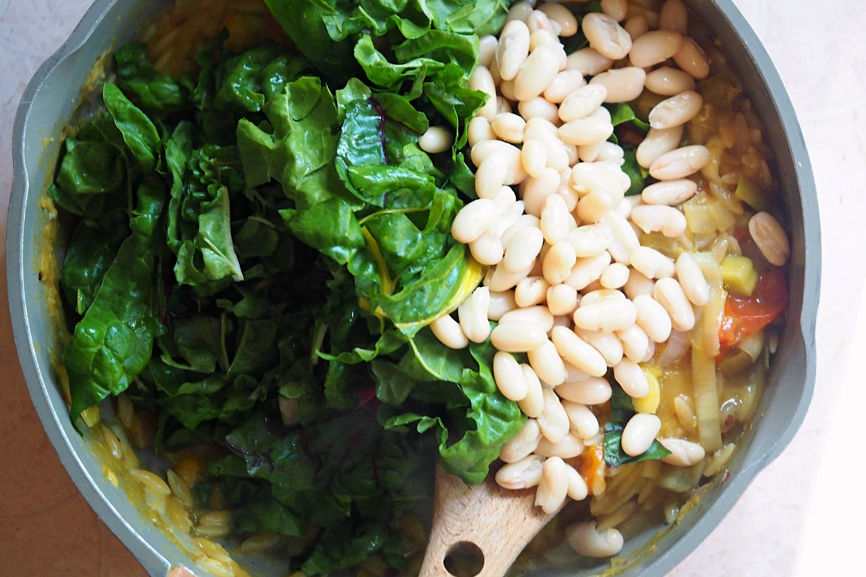 - Check the orzo has cooked and add a further 50-100ml of water if needed, before adding the beans and chard leaves and covering to cook for a further couple of minutes