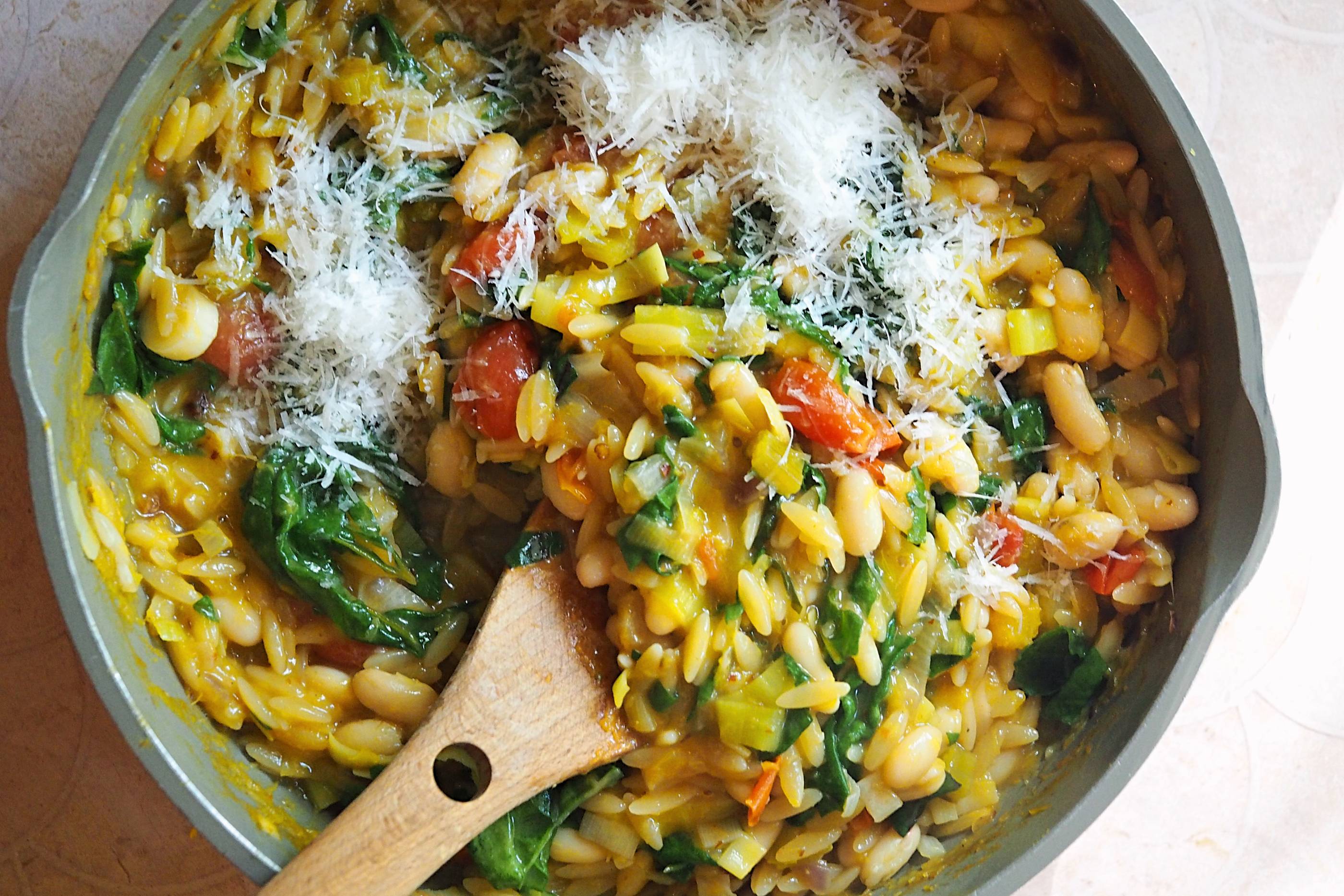 - Toast the orzo with everything else for a couple of minutes before adding the vegetable stock – cover and bring everything to the boil before lowering to a simmer and stirring occasionally (for around 10-15 mins)