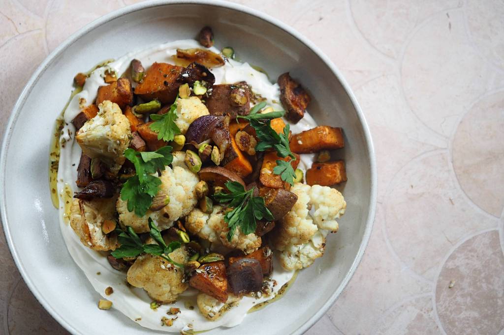 - Spread the tahini yoghurt onto the bottom of your serving plate, add the roasted vegetables over the top, sprinkle over the roasted pistachios and parsley and drizzle on the dressing to serve