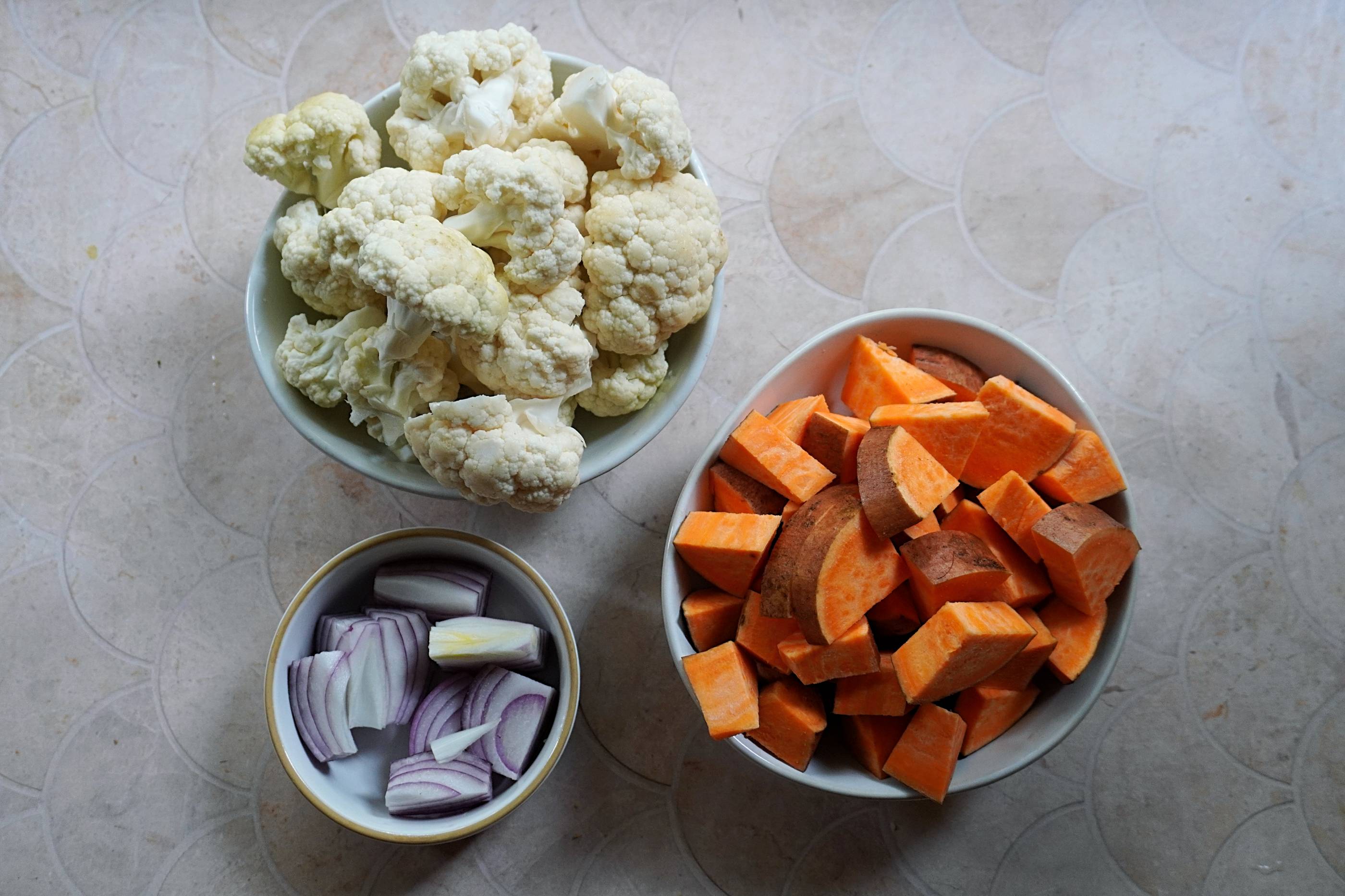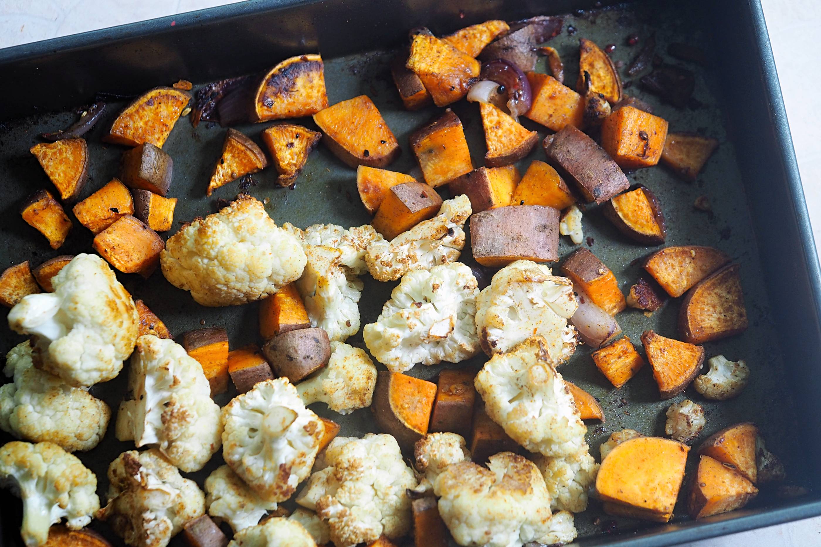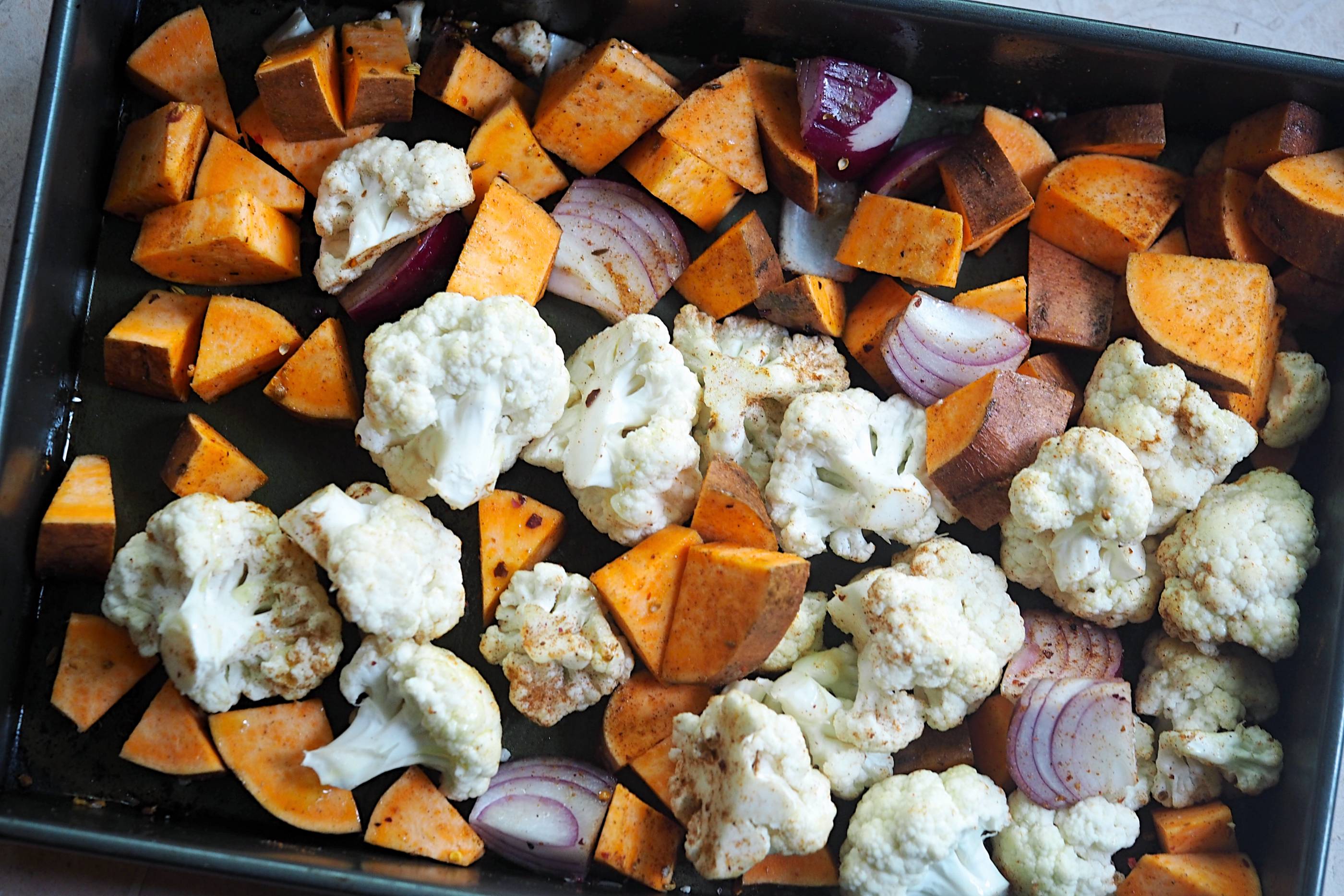 - Add the sweet potato, cauliflower and red onion to an oven dish, sprinkle over the Ras el Hanout, drizzle on some olive oil and then season generously with salt and pepper, toss together to combine and roast for 30 mins, stirring halfway through