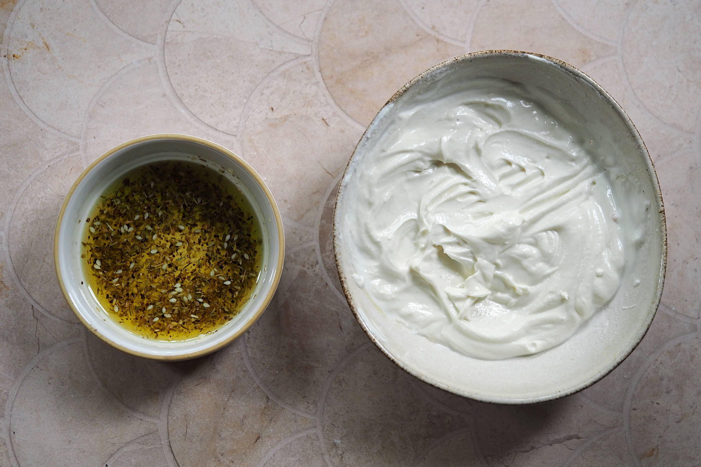- Add the lemon juice and tahini to the Greek yoghurt with some salt and pepper and whisk or stir to combine