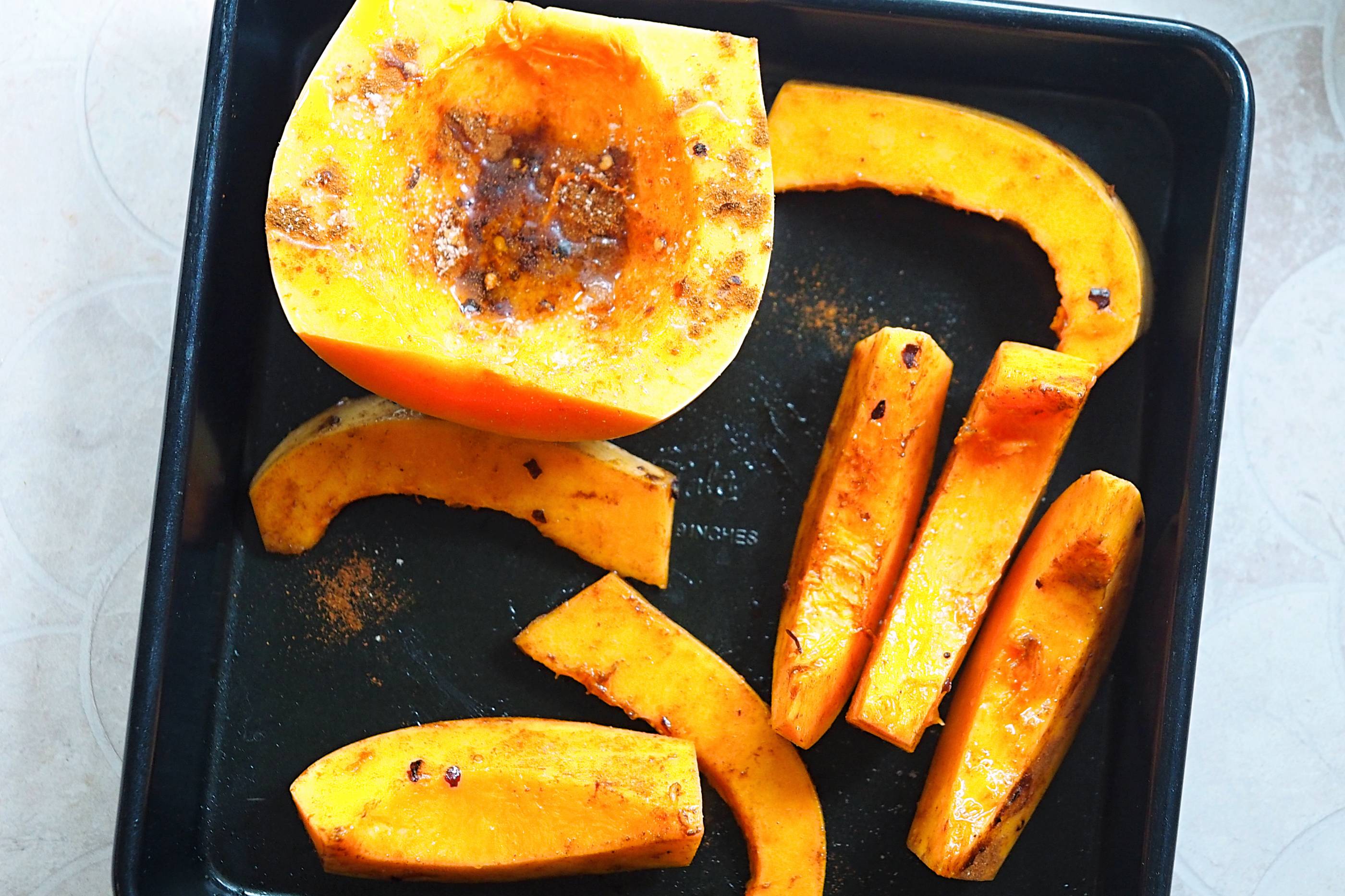 - Add the other half (skin side down) to the oven dish and drizzle with olive oil, add some of the spice mix and salt and pepper into the hollow – roast for 25-30 mins (check on it partway through)