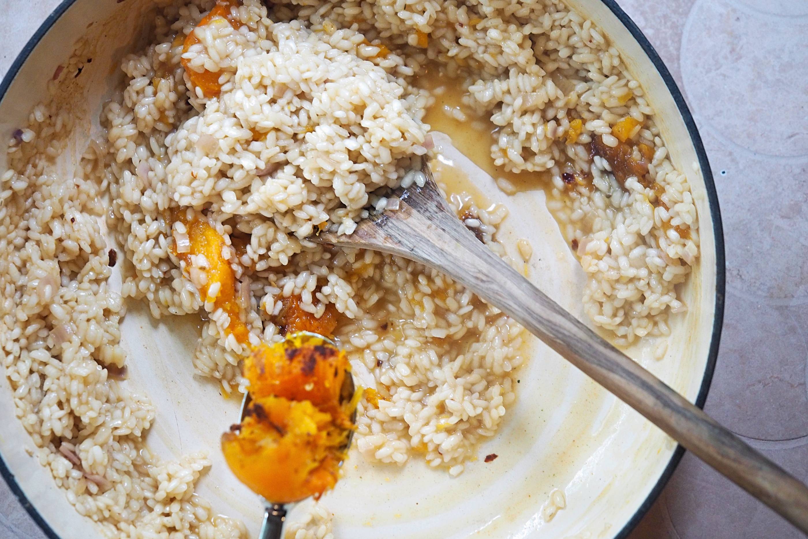 - Once the whole half has cooled long enough to handle, scoop the flesh out and add it to the risotto