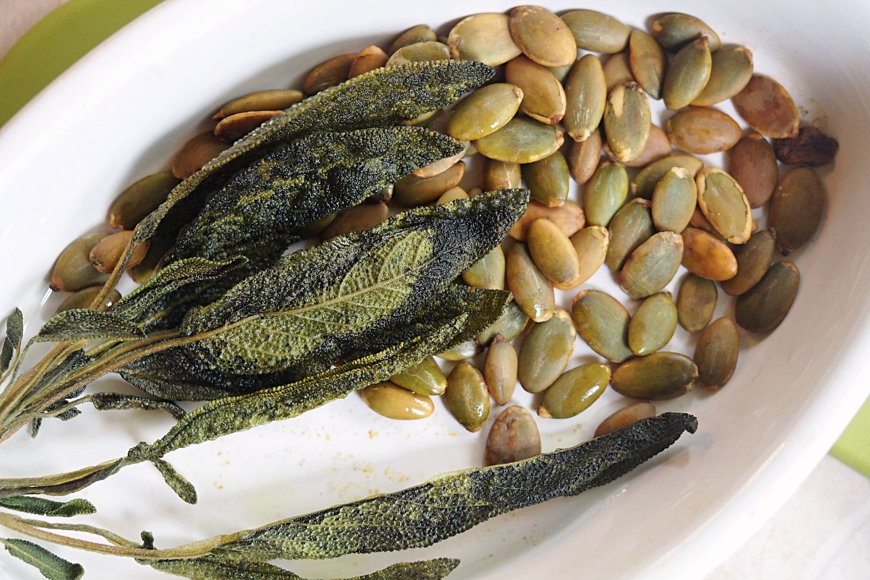 - Remove the sage and pumpkin seeds and whole half of squash from the oven once it’s cooked and soft, to cool slightly, leave the slices in the oven (with the power off) to stay warm