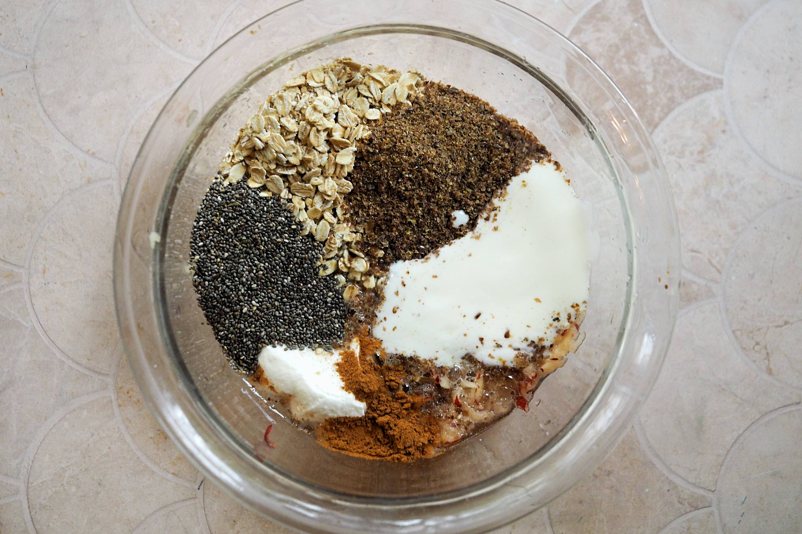 - Add the oats, flaxseed, chia seeds, almond butter, Greek yoghurt, kefir, maple syrup and water (adjusted to your desired consistency) – stir together