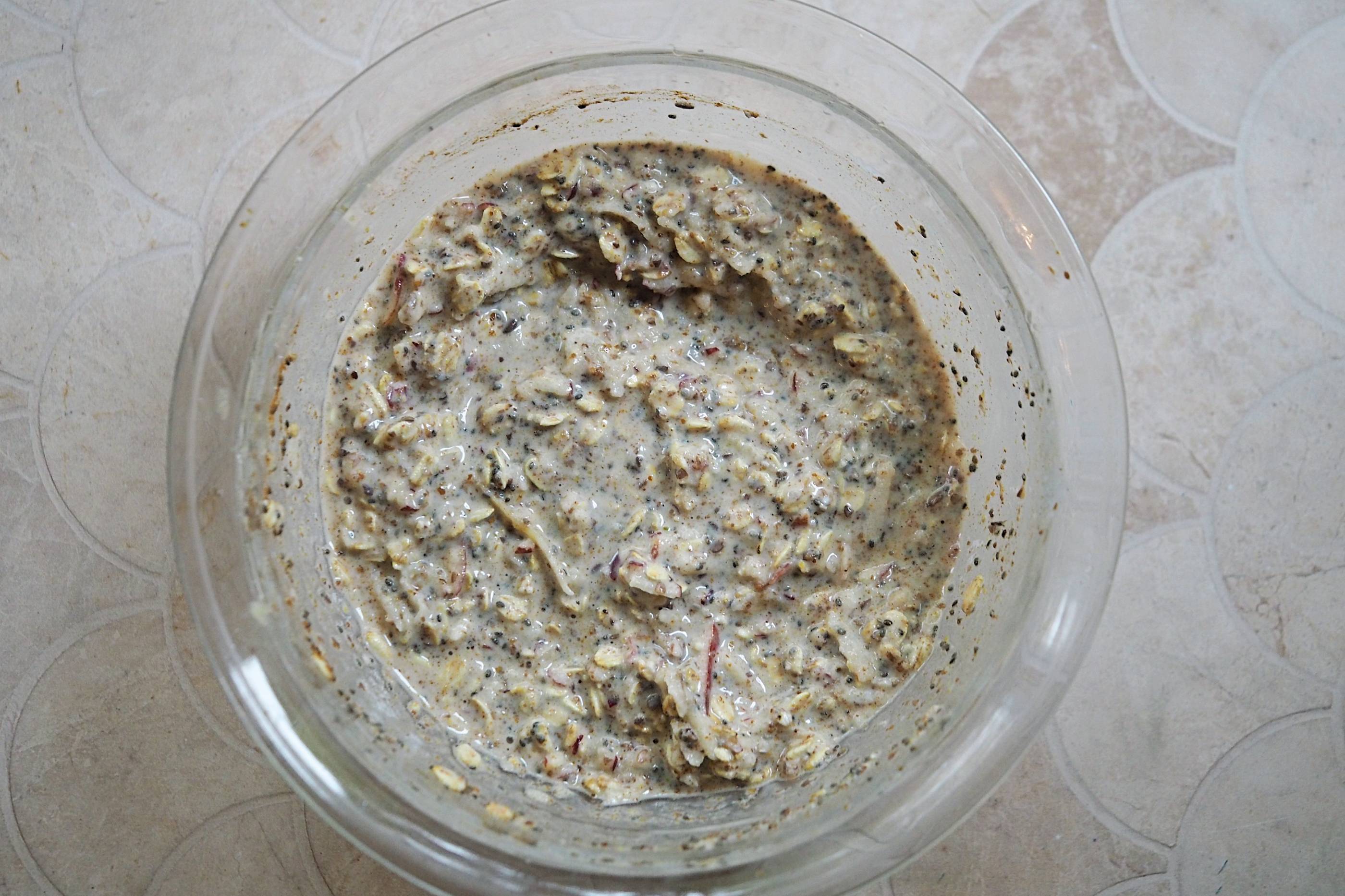 This is a simple recipe, the only decision you really have to make is how much water to add; I used 100ml, though you can add up to 3x more if you prefer a looser, more porridge-like texture (bear in mind that as the oats, chia and flaxseed soak, they absorb a lot of liquid, so always do a little more liquid than it ‘looks’ like it needs). This is bearing in mind that the ingredients (particularly the chia seeds) will thicken up the texture as they soak and absorb moisture. This keeps for around 4 days in the fridge. Some people prefer to add the apple before serving but I find it doesn’t make much of a difference so I’d rather save time and do it all in one go.