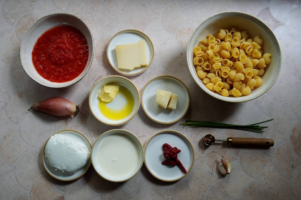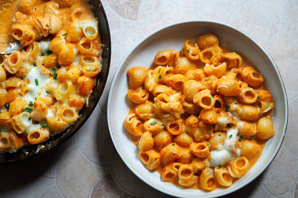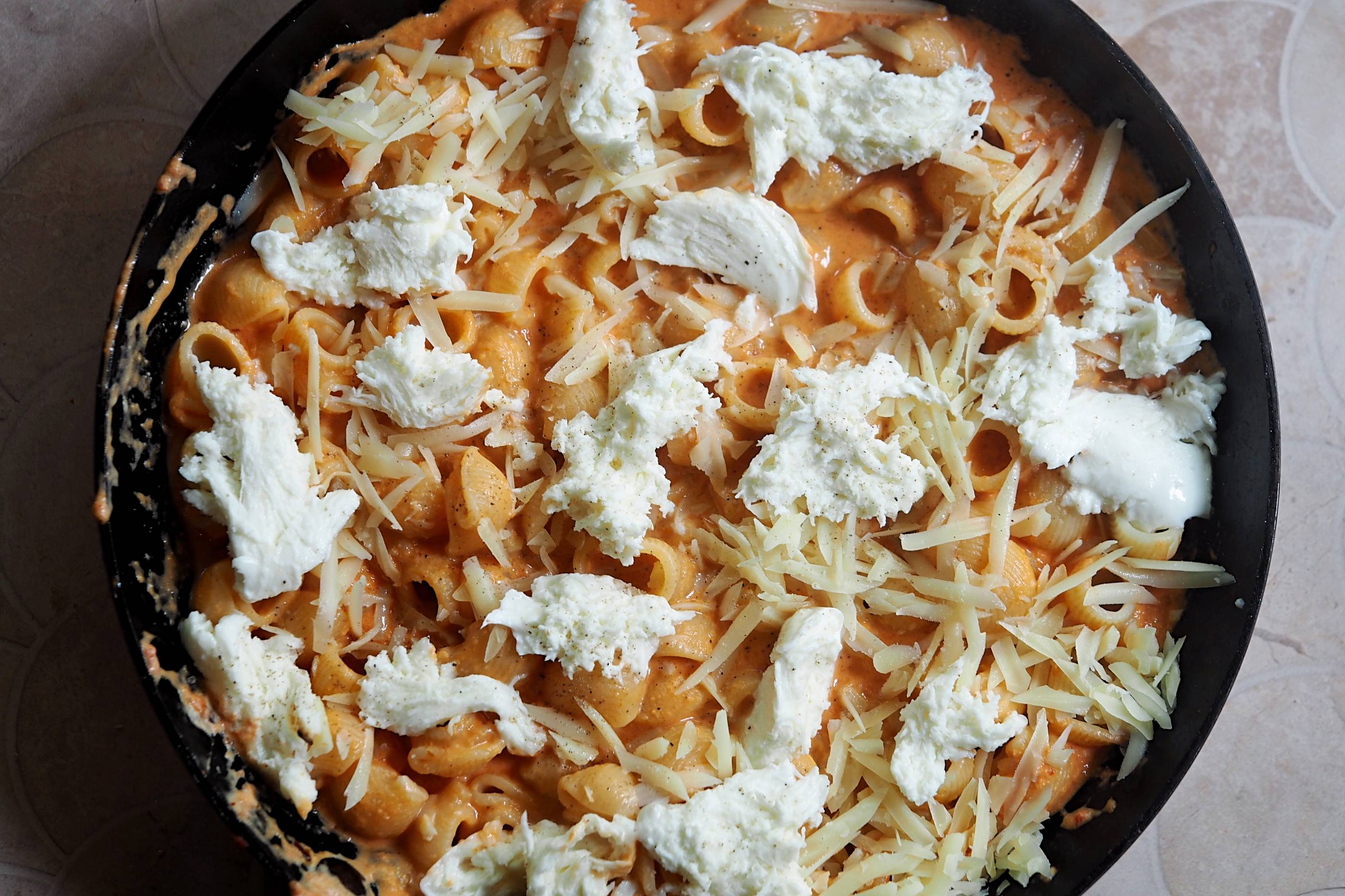Most of my recipes are designed to be healthy but tasty, but if you’re eating healthy 80% of the time, it’s fine to enjoy foods that you just enjoy in the form you like to have them. This is a tasty crowd-pleasing pasta that’s quick and easy. Essentially a ‘pasta alla vodka’ without the vodka (so a creamy, spicy, tangy, tomato-y pasta) finished off in the oven for a crispy, stringy mozzarella topping – perfect for festive season!