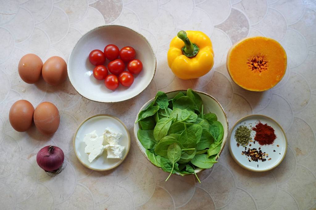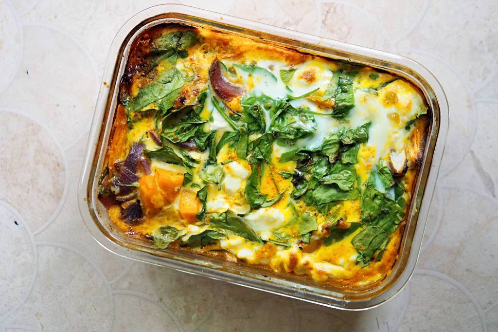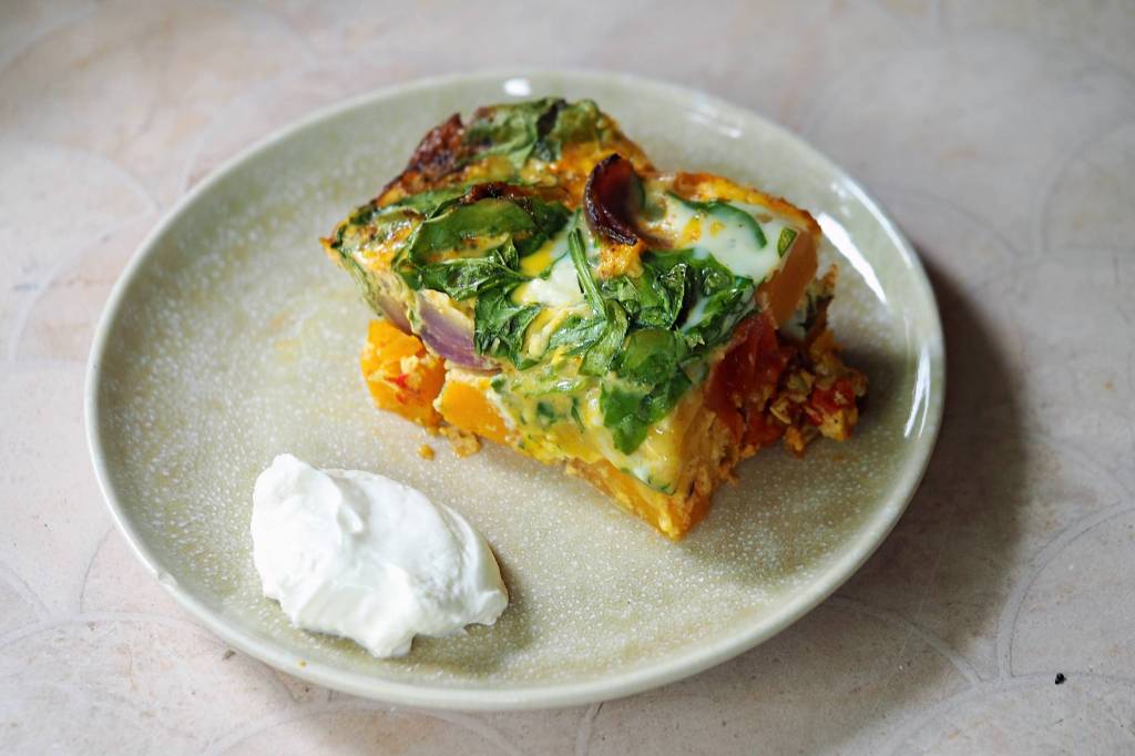 - Remove the roasted vegetables from the oven after its 20-minute head-start (check that the squash can be pierced with a fork) and pour over the egg mixture – return to the oven for a further 10 mins