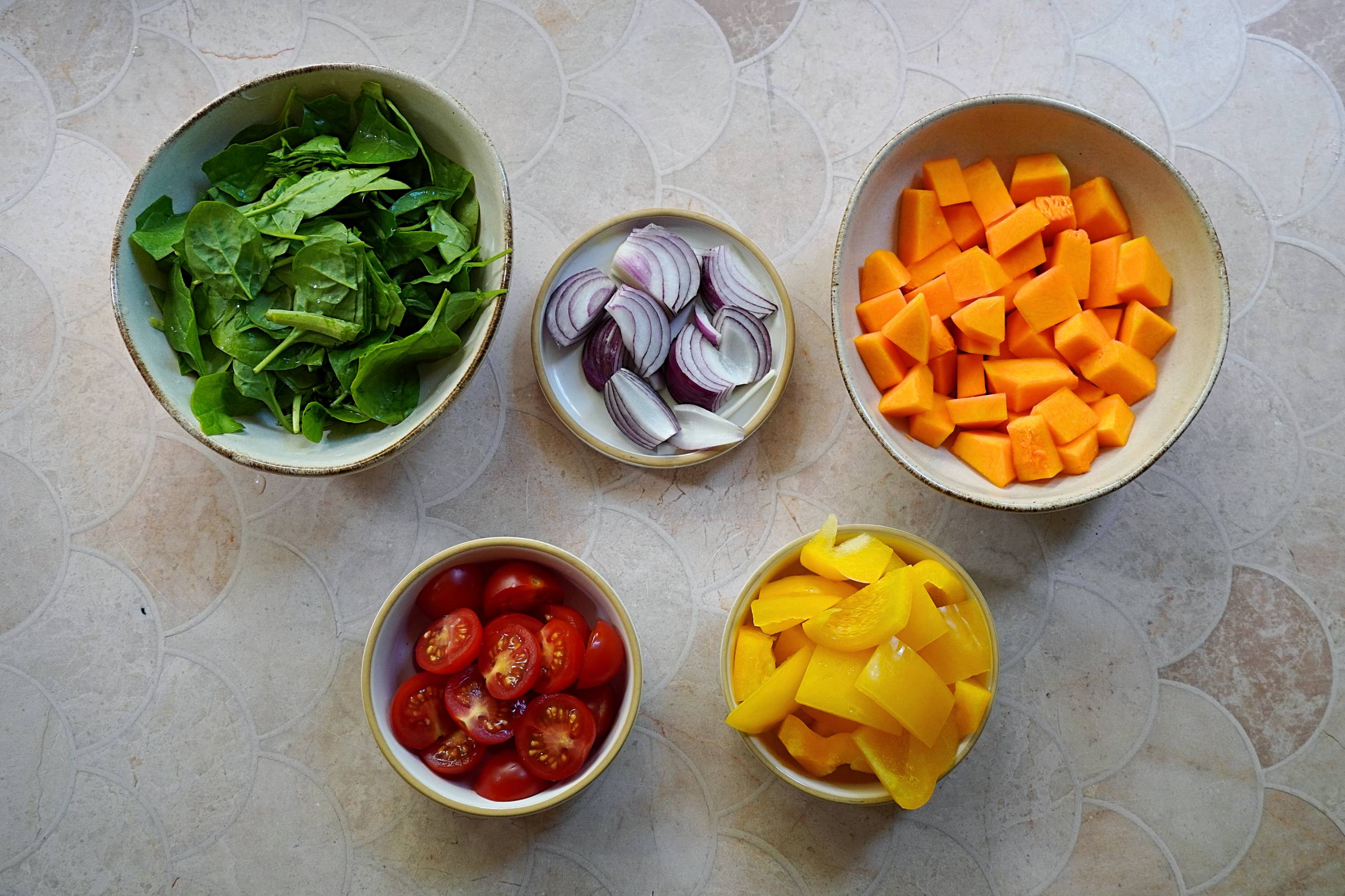 - Lightly grease an ovenproof dish with some olive oil and add the squash, yellow pepper, red onion and cherry tomatoes, season with salt and pepper, sprinkle over the oregano, chilli flakes and smoked paprika and drizzle over a little extra olive oil – toss this all together and roast in the oven for 20 mins (stirring halfway through)