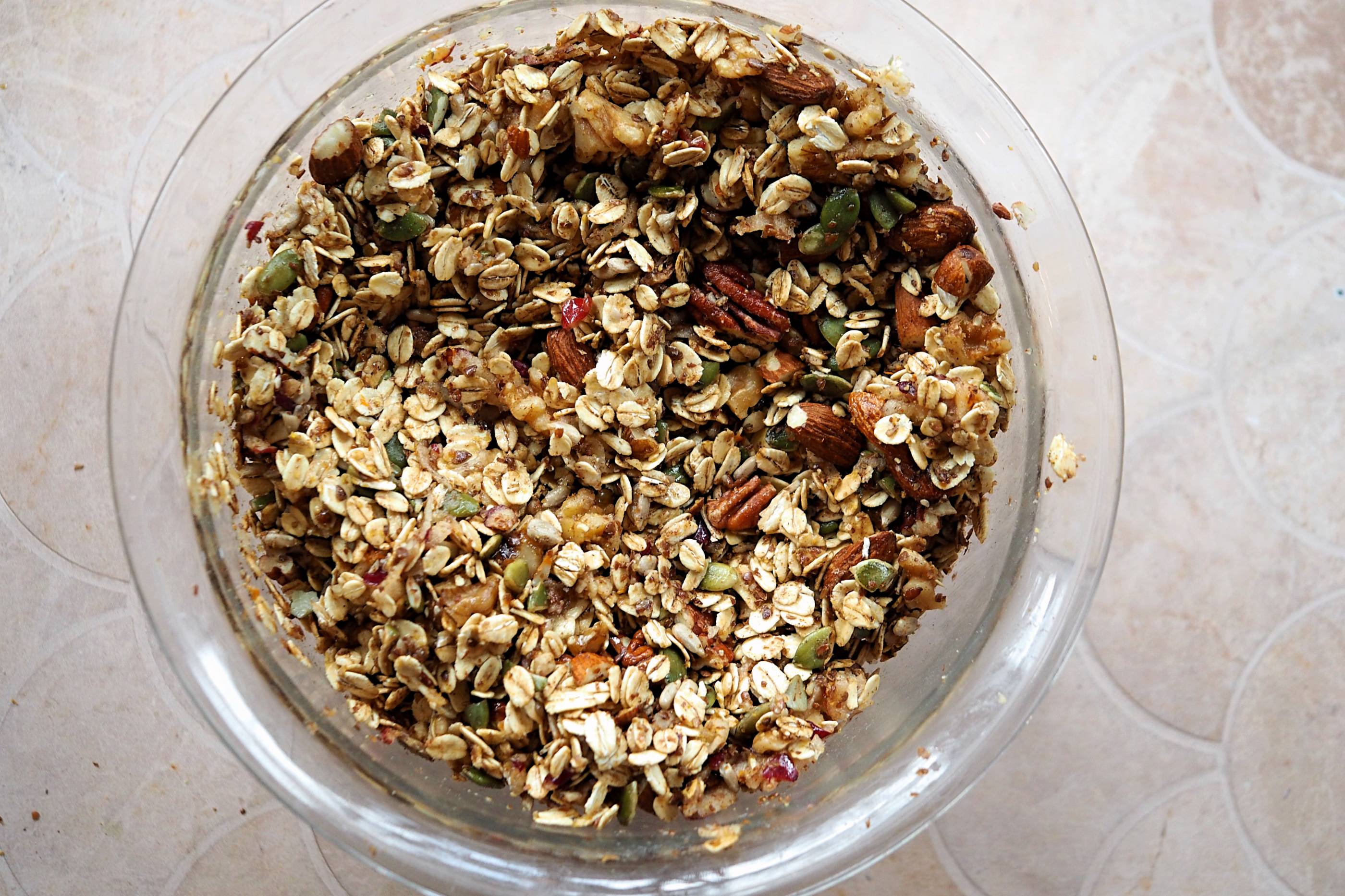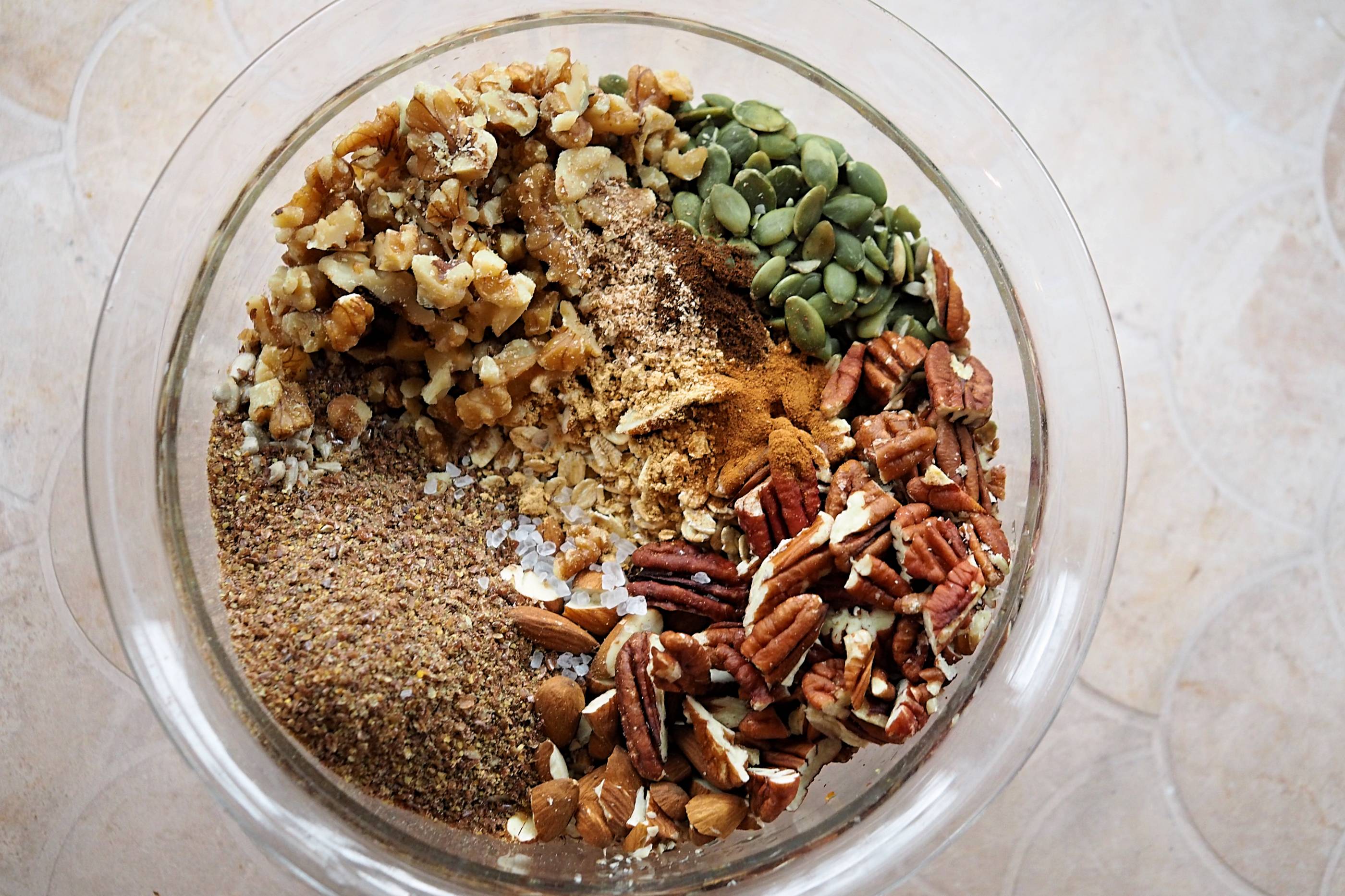- Add the walnuts, pecans, almonds, pumpkin seeds, sunflower seeds flaxseed, oats, salt and spices