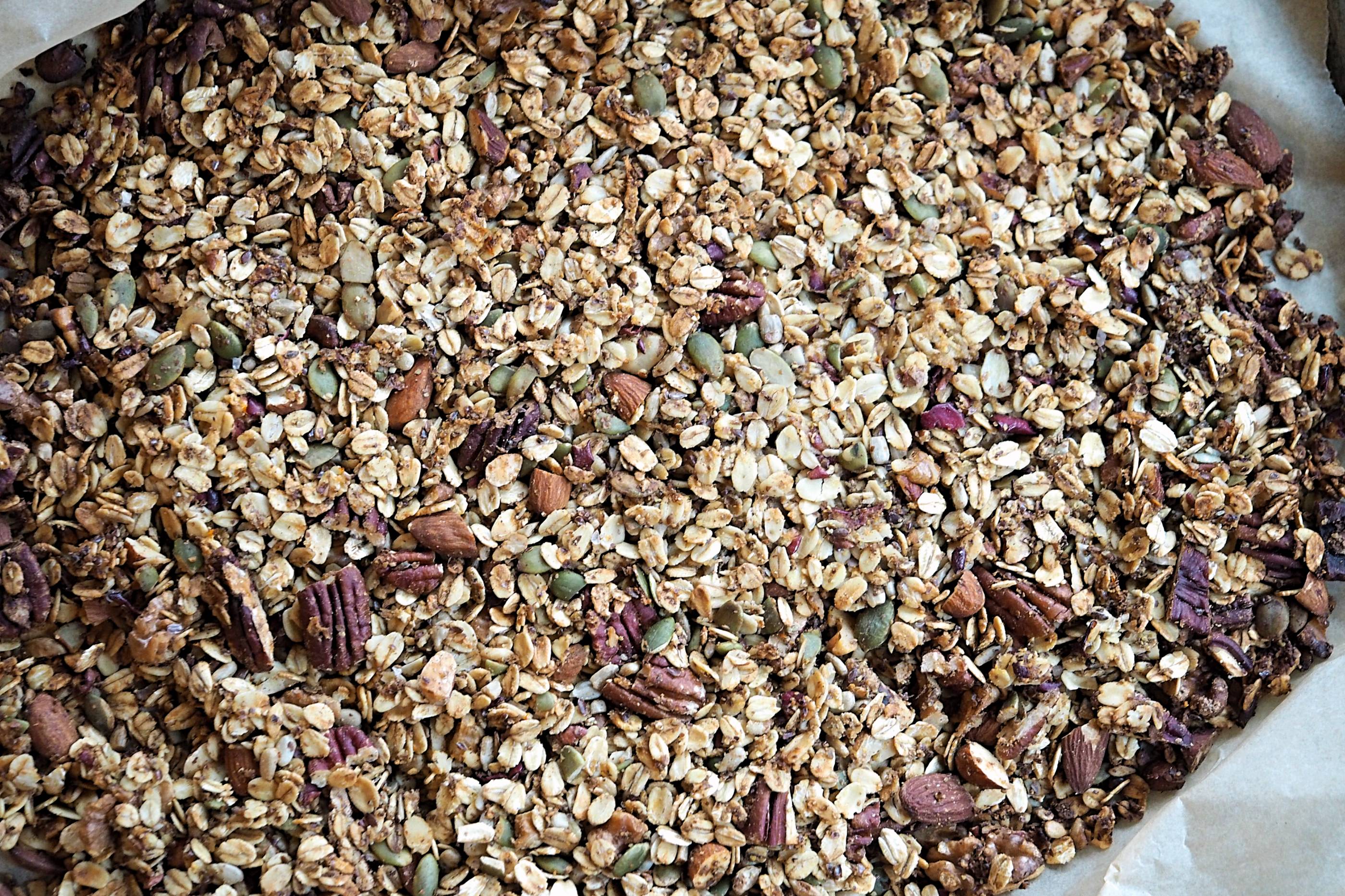 This is a simple recipe but a few tips: firstly, feel free to swap out different kinds of nuts and seeds, but keep the quantity the same because the final granola is dependent on the ratio of wet to dry ingredients. I also really recommend flattening / packing the granola down before baking and then allowing it to cool fully on the baking sheet afterwards. This allows it to form small clusters and then you can throw in the additions.