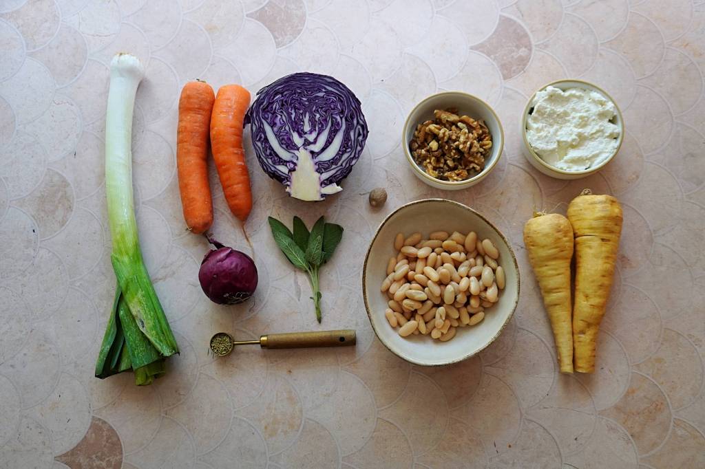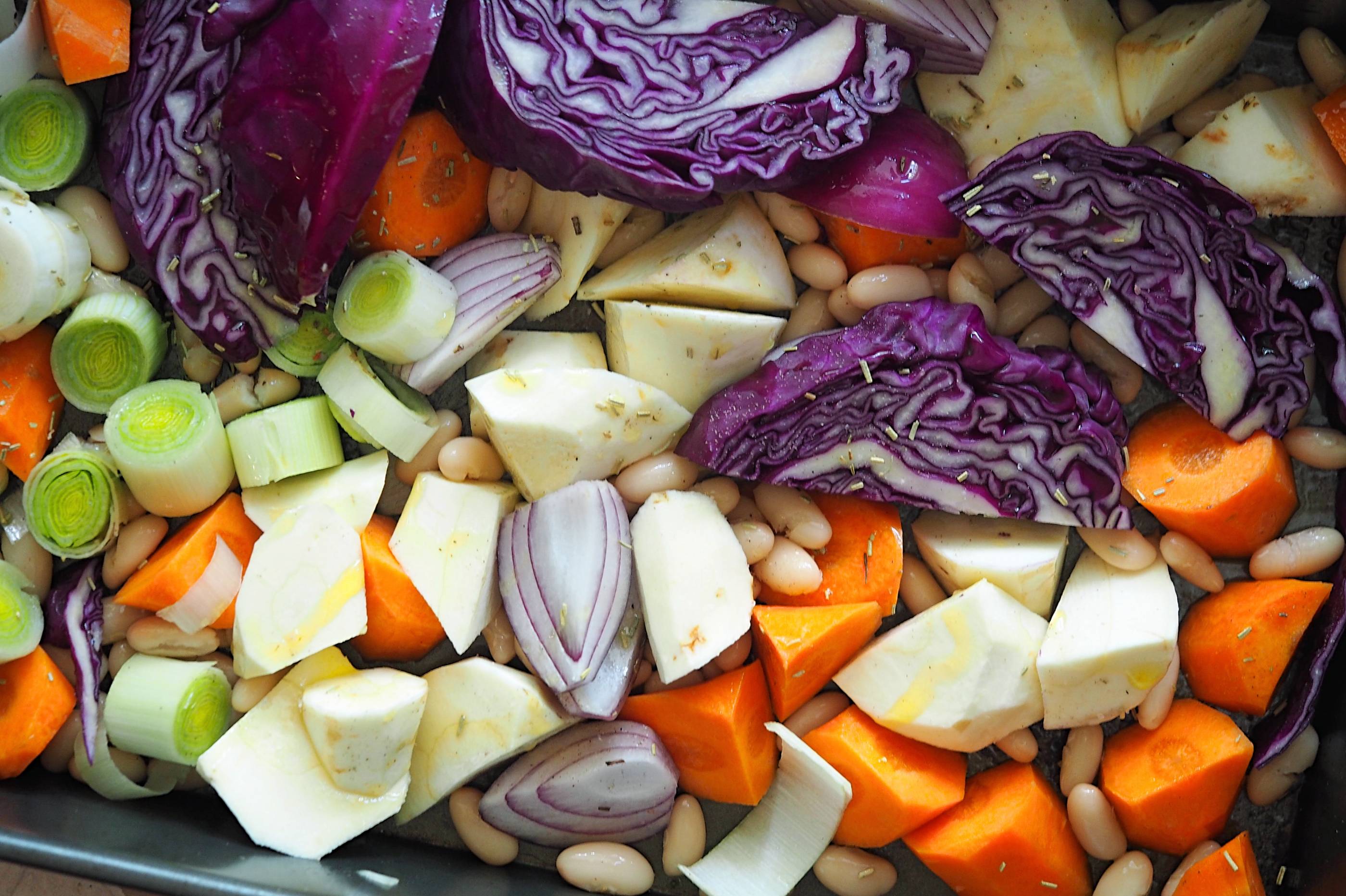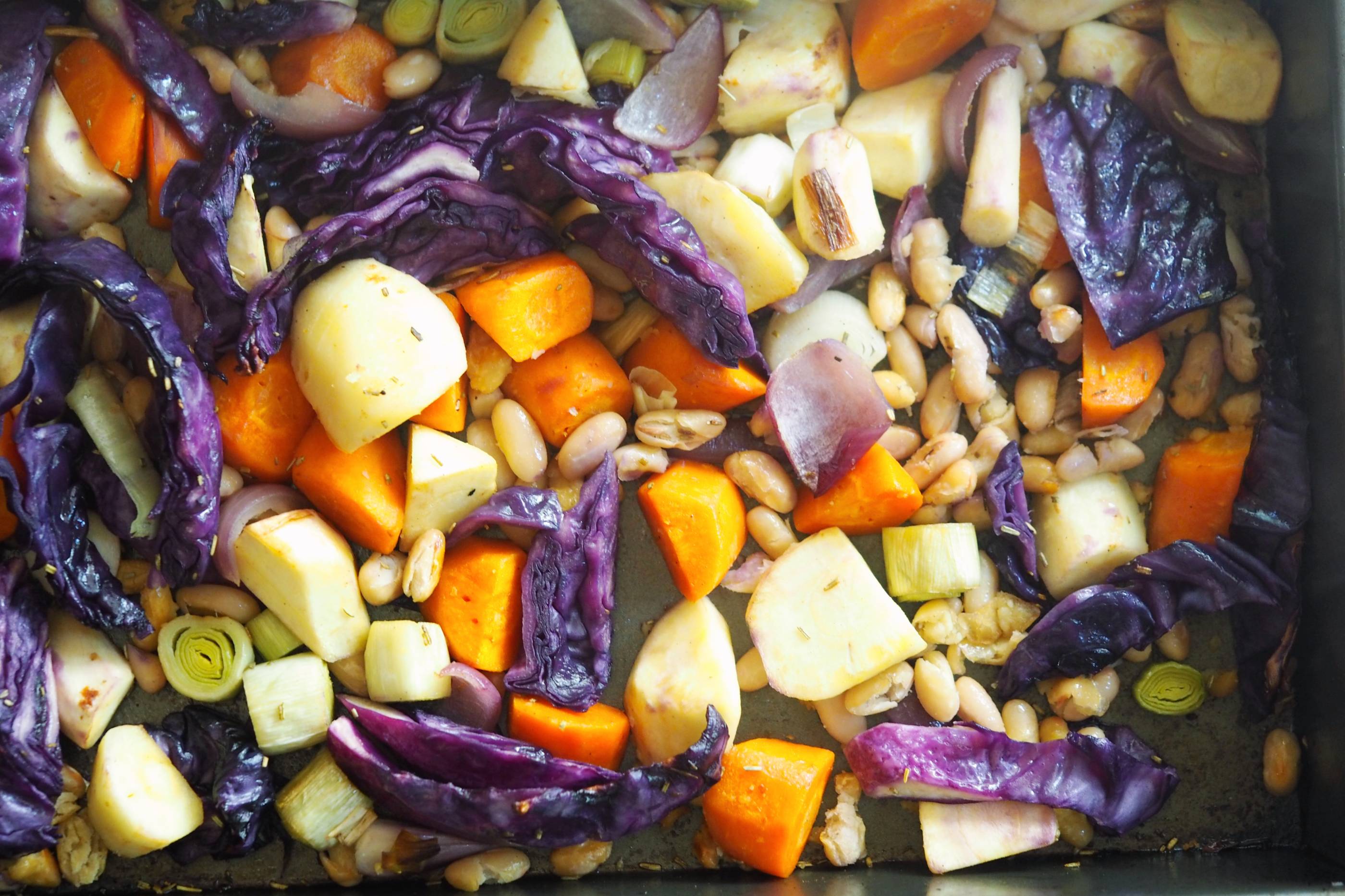 - Add the carrots, parsips, leek, red cabbage, red onion and white beans to a roasting tin, drizzle over some olive oil, season well with salt and pepper and sprinkle on the rosemary – roast in the oven for 25-30 mins, tossing the vegetables halfway through