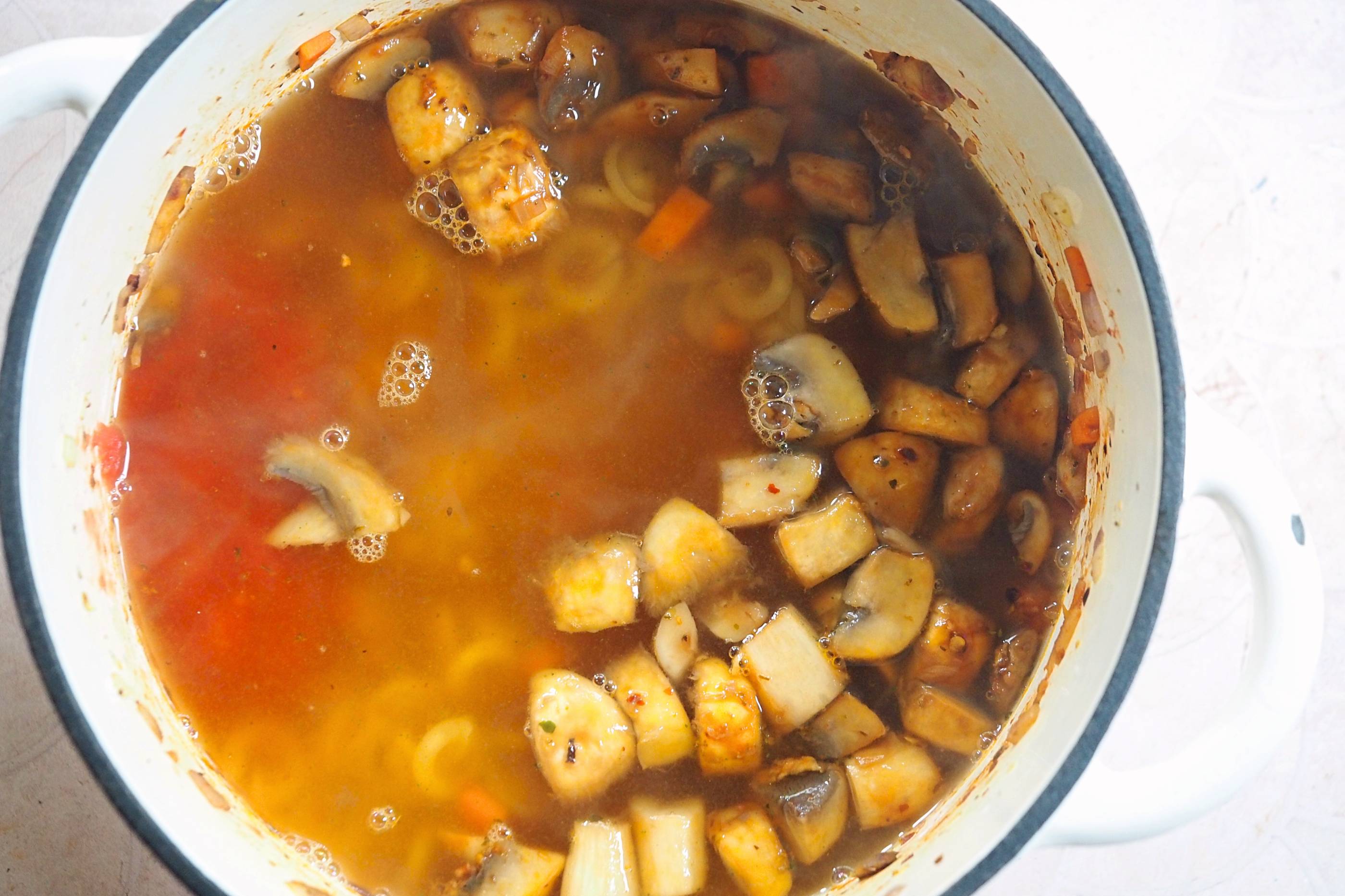 - Add the optional rind, pasta, finely chopped tomatoes and 1L of vegetable stock to the pot, cover and bring to the boil before reducing to a simmer for 8 mins or so (until the pasta is cooked al dente)