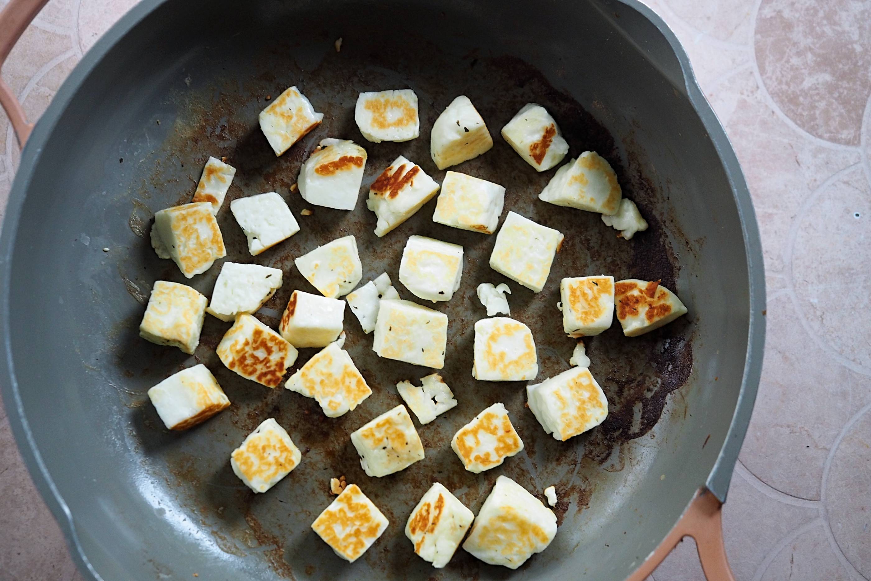 - In a lidded, wide-based pan over a medium heat, fry the halloumi on both sides until golden (this will take a few mins on each side) and remove from the pan