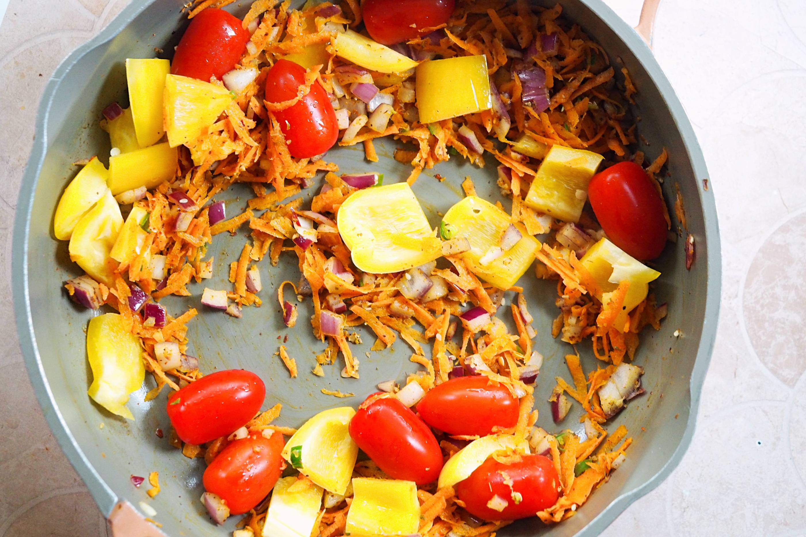 - Add the grated carrot and yellow pepper and continue to sauté for a further 5-7 mins before adding the orzo and toasting for a minute or two