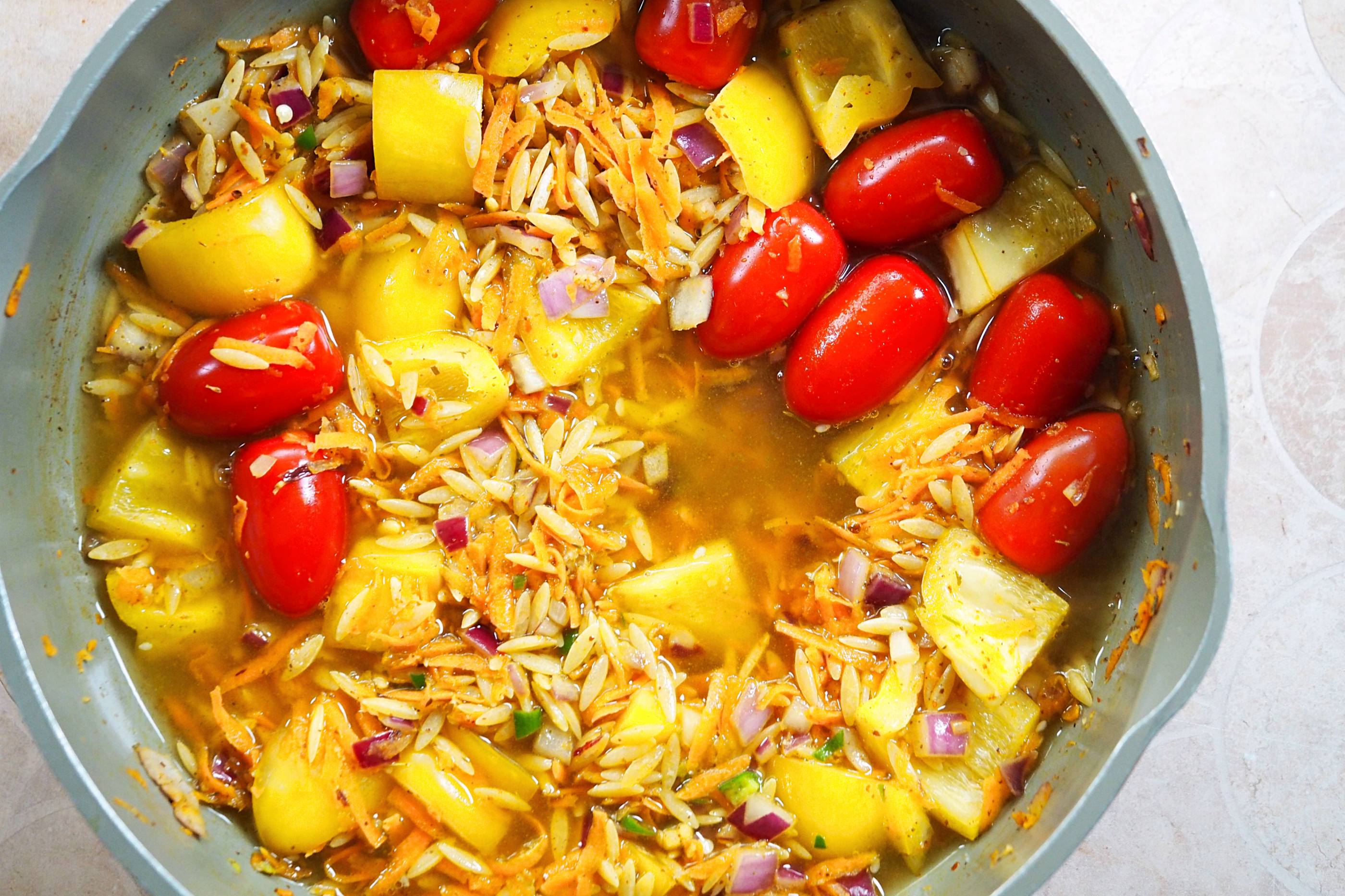 - Dissolve the vegetable stock cube in 300ml of boiling water and add this to the pan along with the tomatoes – cover and bring to a boil before reducing to a simmer for around 15 mins until the orzo is cooked