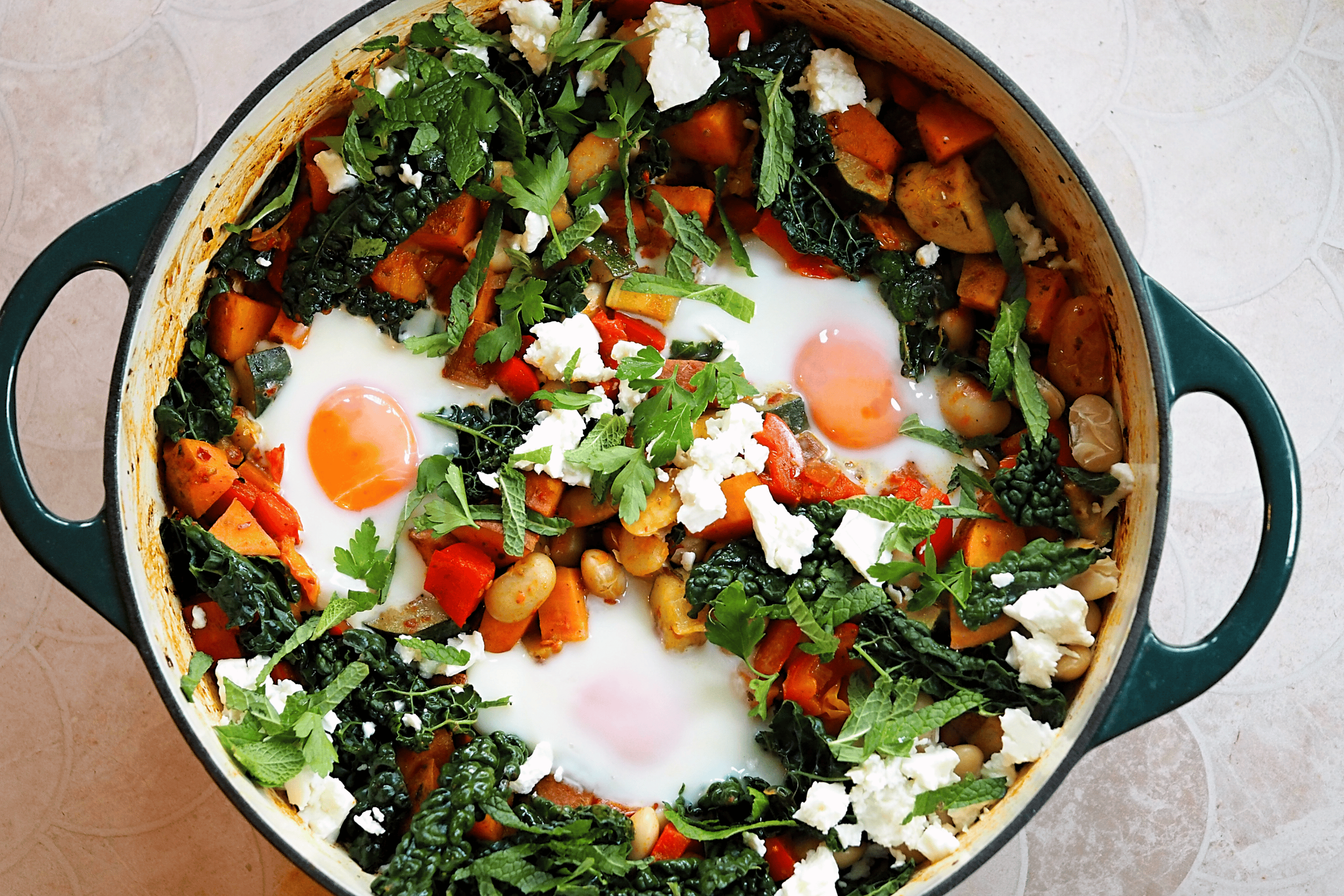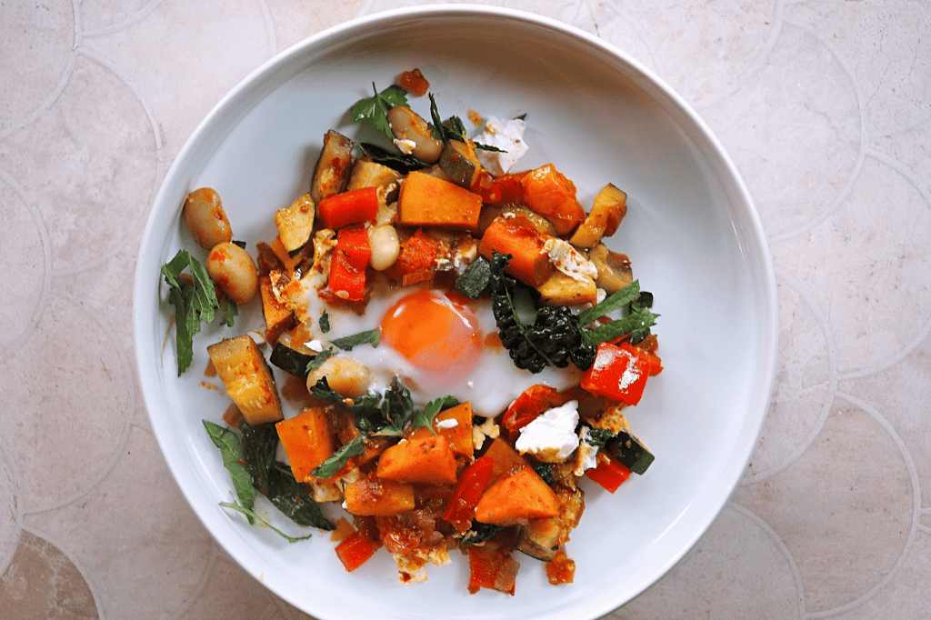 An egg and potato breakfast hash made fresher and healthier with plenty of roast vegetables