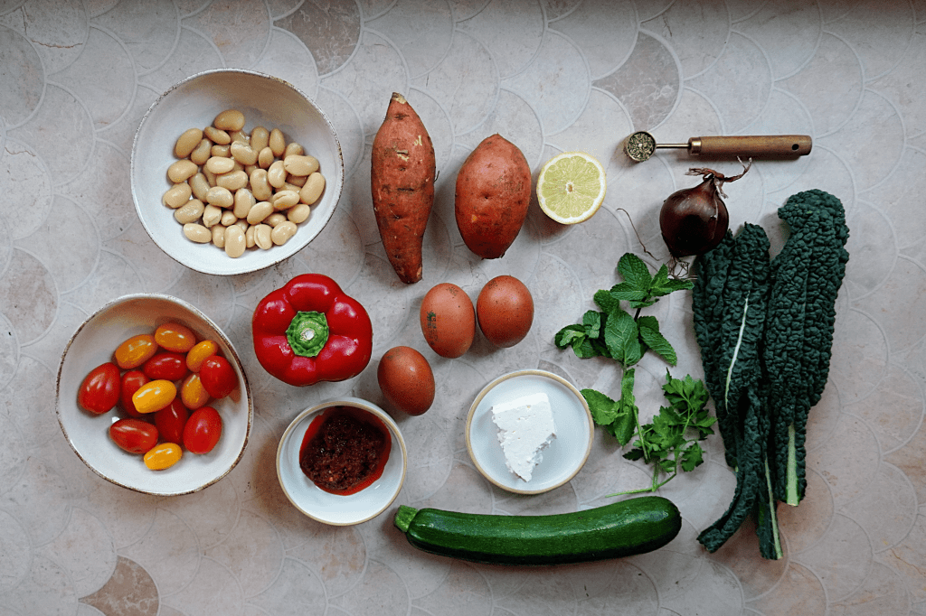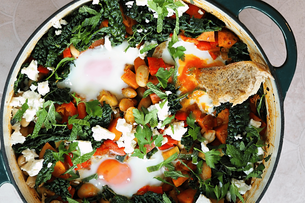 - Remove from the oven once the sweet potato is cooked through and add the butter beans and cavolo nero and cook for a further 5 minutes