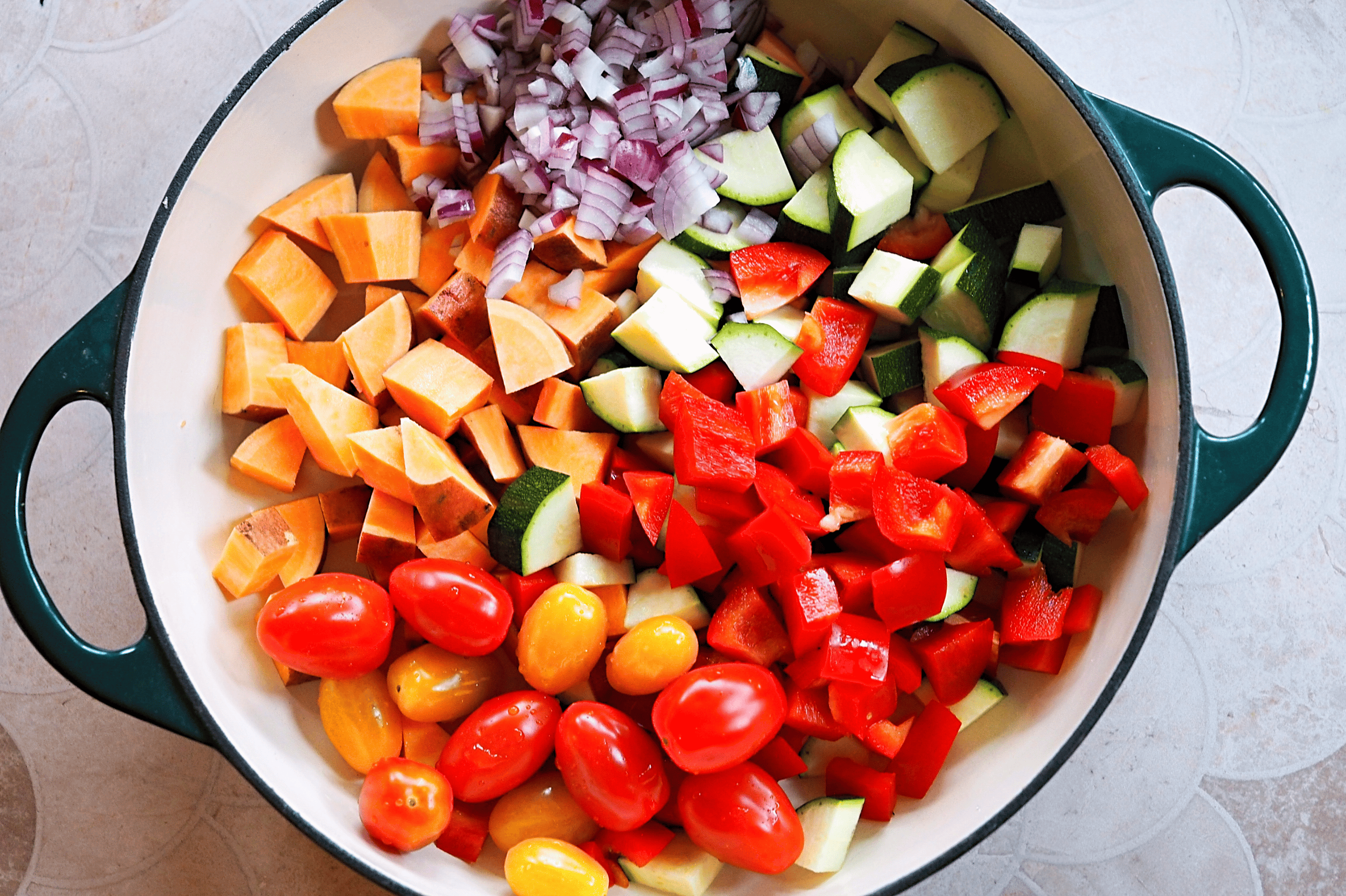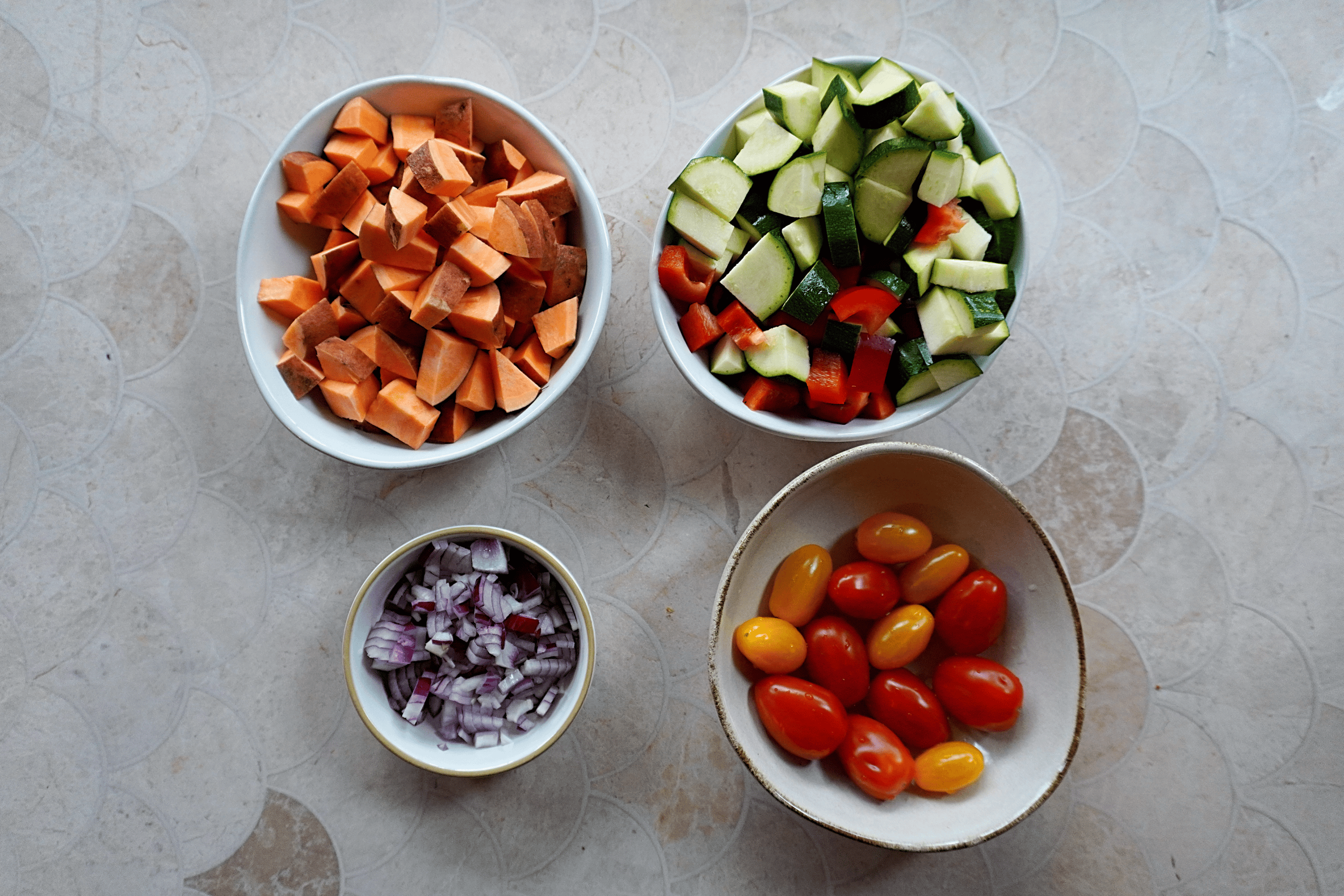 - Add the courgette, baby tomatoes, sweet potato, pepper and red onion to a lidded, oven safe dish, sprinkle over the oregsno, drizzle over a little olive oil, season with salt and pepper and stir through the rose harissa paste